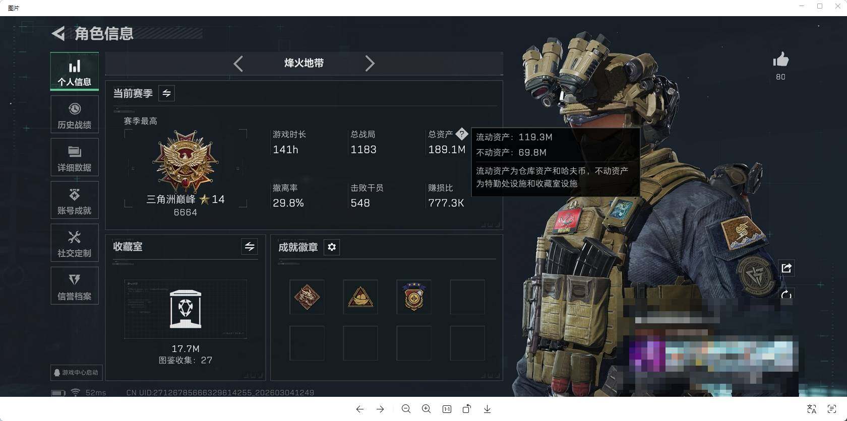 【总资产188M流动资产119M哈夫币437w】--全面战场等级: