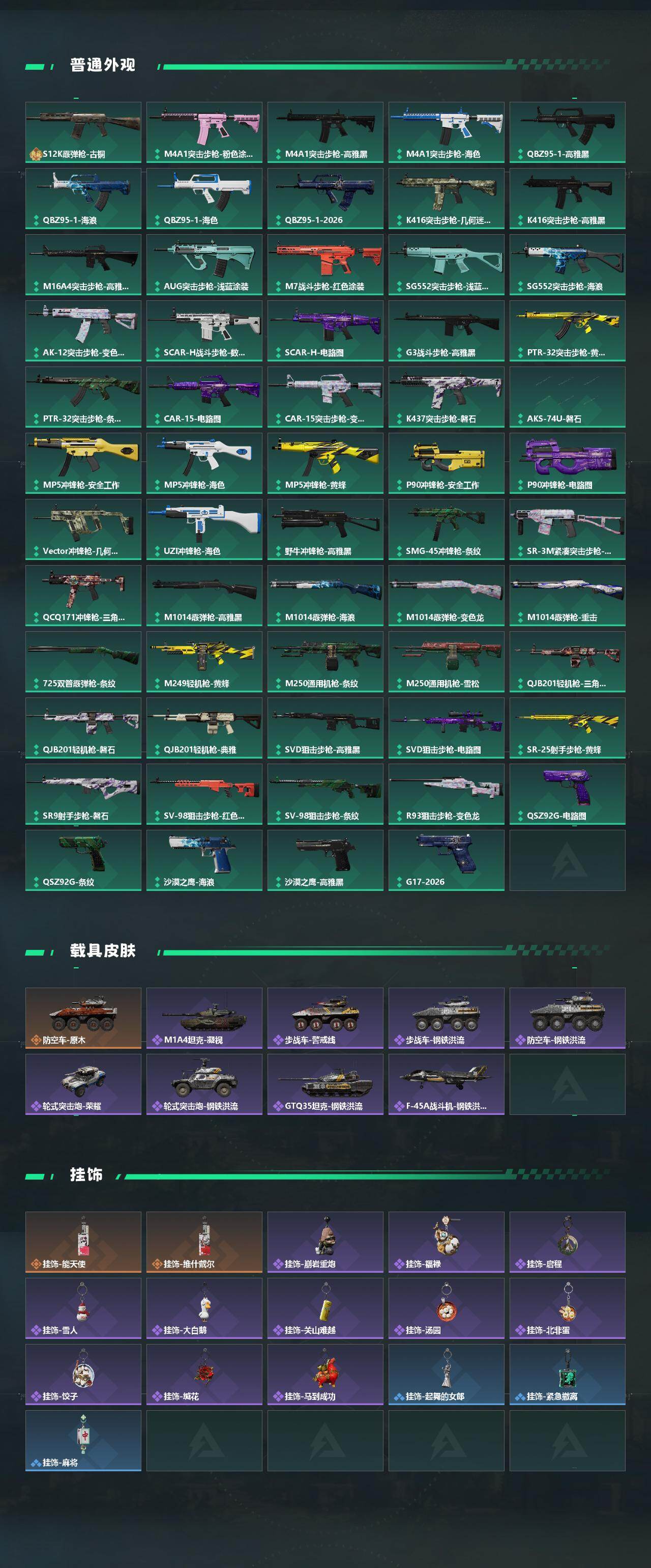 【传说外观】:M4A1突击步枪-阿米娅,ASh-12战斗步枪-鹅鸭杀,SG552突击步枪-运动员,SCAR-H战斗步枪-启航,腾龙突击步枪-马年祥瑞,KC17突击步枪-电锯惊魂,Vector冲锋枪-能天使-午夜邮差,勇士冲锋枪-能天使-午