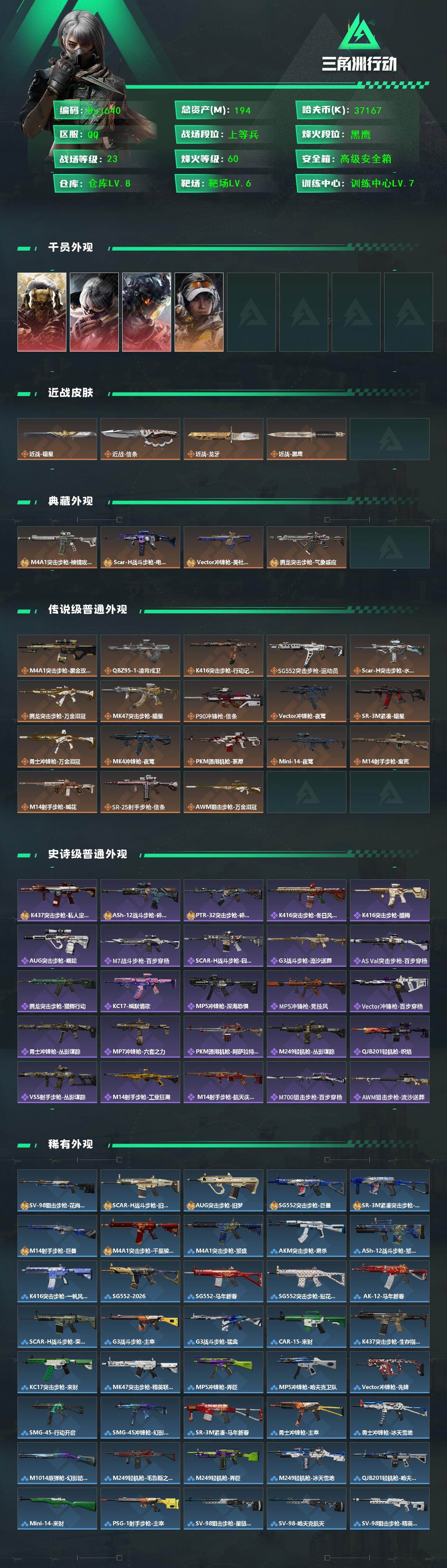 【特价秒杀】【总资产194M流动资产144M哈夫币3716w】可二次--全面战场等级:23/烽火地带等级:60【蚀金玫瑰,水墨云图,凌霄戍卫,暗星,信条,龙牙】SCAR-H战斗步枪-电玩高手(宝石蓝极品B)/腾龙突击步枪-气象感应(电属性优品C)