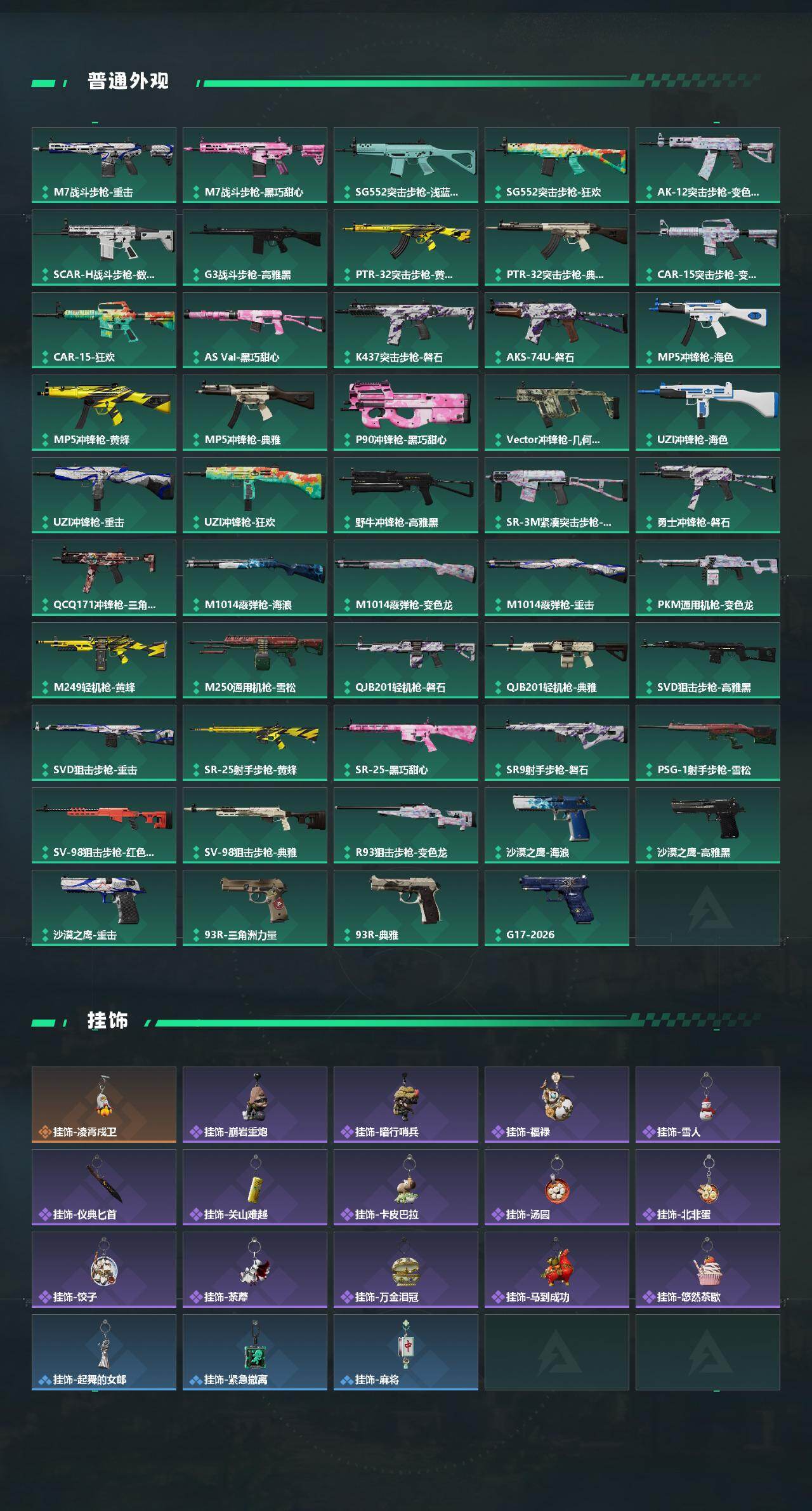 【传说外观】:AUG突击步枪-悠然茶歇,SG552突击步枪-运动员,SCAR-H战斗步枪-荼蘼,腾龙突击步枪-马年祥瑞,腾龙突击步枪-万金泪冠,MK47突击步枪-悠然茶歇,UZI冲锋枪-悠然茶歇,SR-3M紧凑