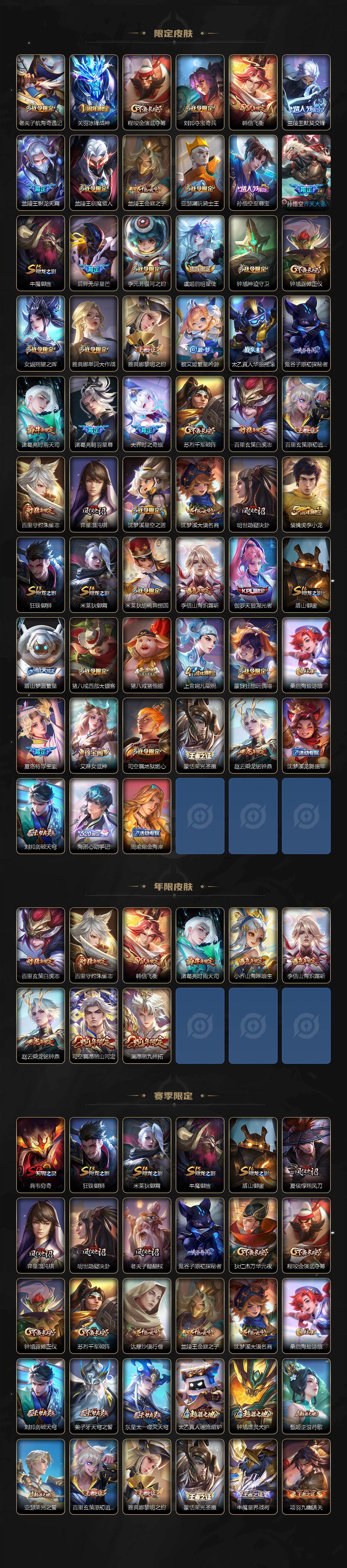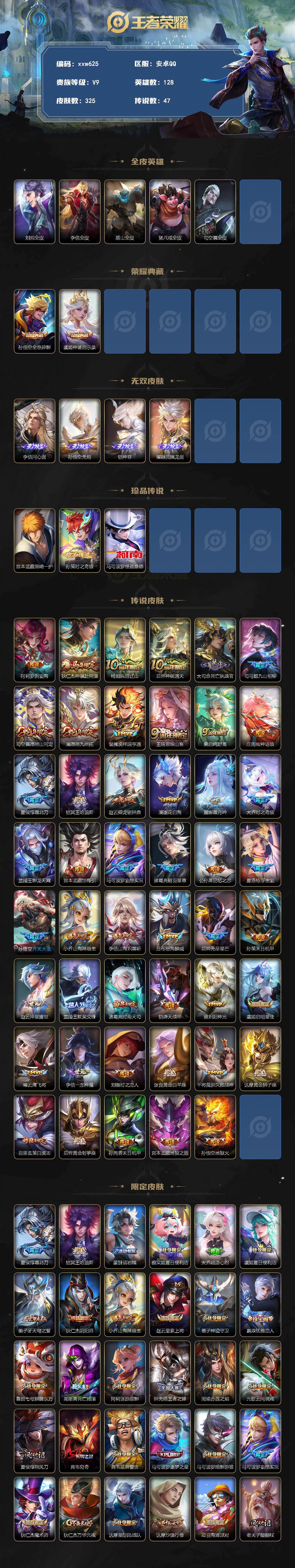 【xxw625】贵族9/皮肤325/典藏2/传说47/史诗89/英雄128/刘邦全皮/李信全皮/盾山全皮/猪八戒全皮/司空震全皮/孙悟空-全息碎影/虞姬-神鉴启示录/李信问心剑/孙悟空无相/凯-神罪/曜-器灵·螭龙剑/宫本武藏-黑崎一护/孙策-时之奇旅/马可波罗-怪盗基德/阿轲罗刹妄海/狄仁杰神骥赴朔漠/杨戬纵目迁山/后羿神树通天/大司命死亡执政官/九山相柳/司空震-愿照·山河定/澜-愿照·九州拓/裴擒虎-祥瑞亨通/王昭君-映山客/桑启-鸣野蒿/庄周-牧神诗旅/夏侯惇-霜北刀/铠-冥王哈迪斯/赵