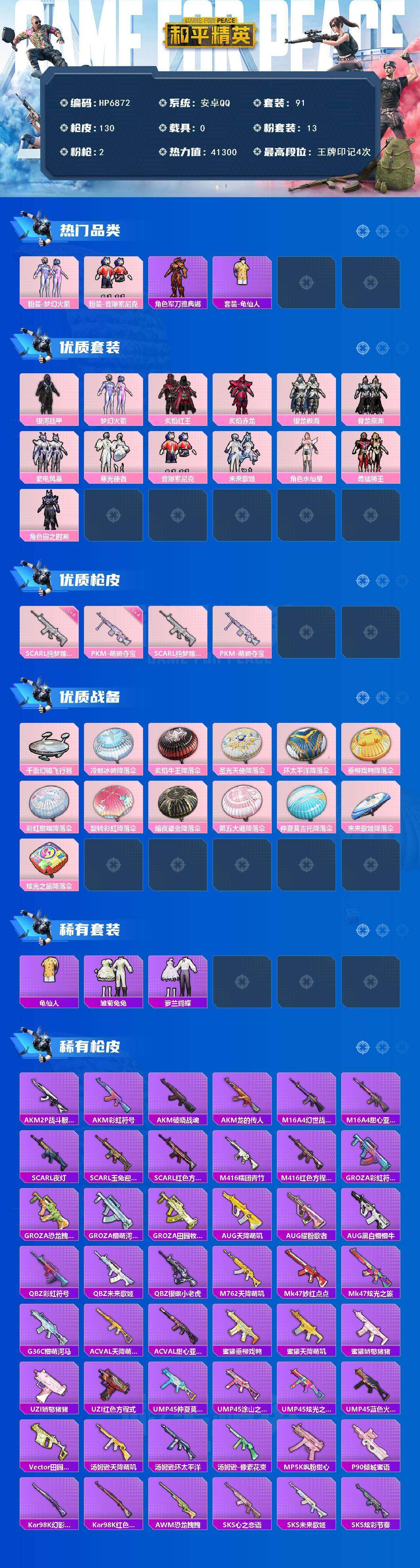 (13粉套2粉枪)银河战甲/梦幻火箭/炙焰红王/炙焰赤龙/银龙傲海/骨龙祭渊/紫电风暴/寒光使者/音爆索尼克/未来歌姬/水仙星/勇猛狮王/宙之时溯/军刀雅典娜/SCAR纯梦嫁纱6级/PKM萌骑夺宝4级/无战神框/HP6872-1粉色飞行器-41300热力值-4王牌印记-91套装-130枪皮