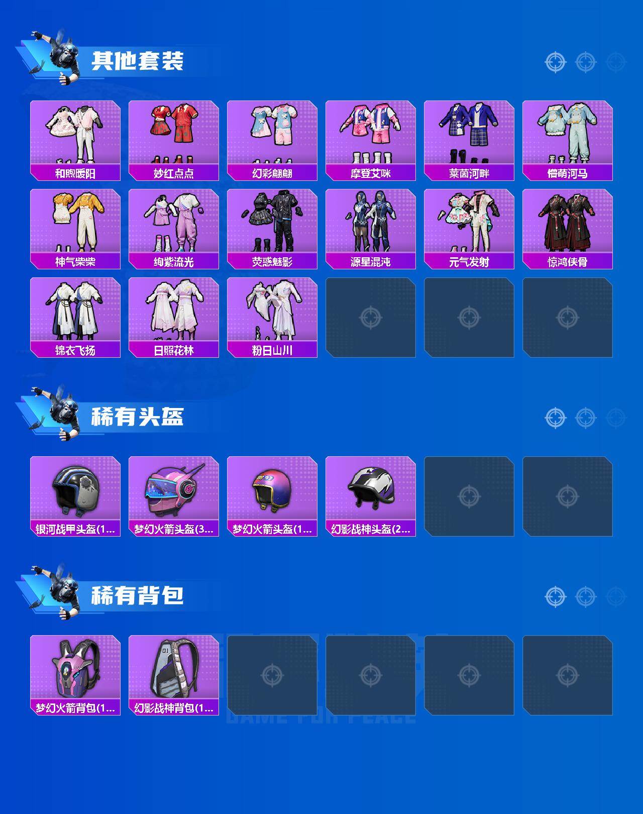 【粉色套装】:粉装-银河战甲,粉装-梦幻火箭,粉装-炙焰红王,粉装-炙焰赤龙,粉装-银龙傲海,粉装-骨龙祭渊,粉装-紫电风暴,粉