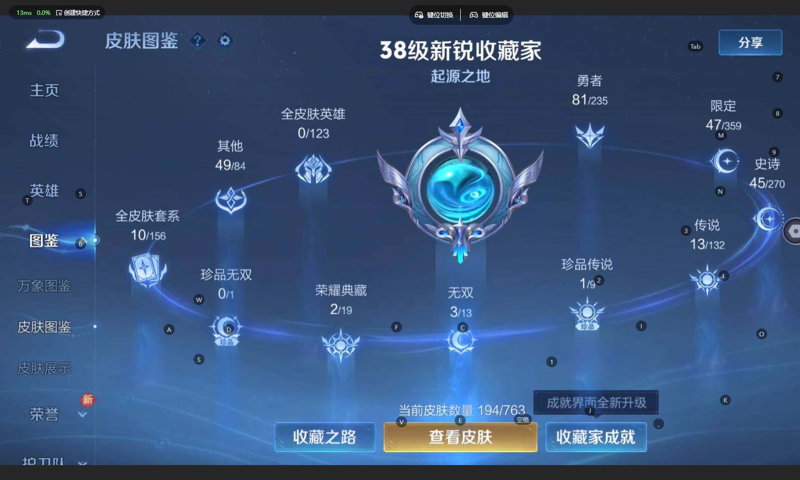 安卓WX-V8-荣耀黄金II段位-127英雄-194皮肤-2典藏皮肤-3无双-1珍品传说-13传说-47限定-15按键