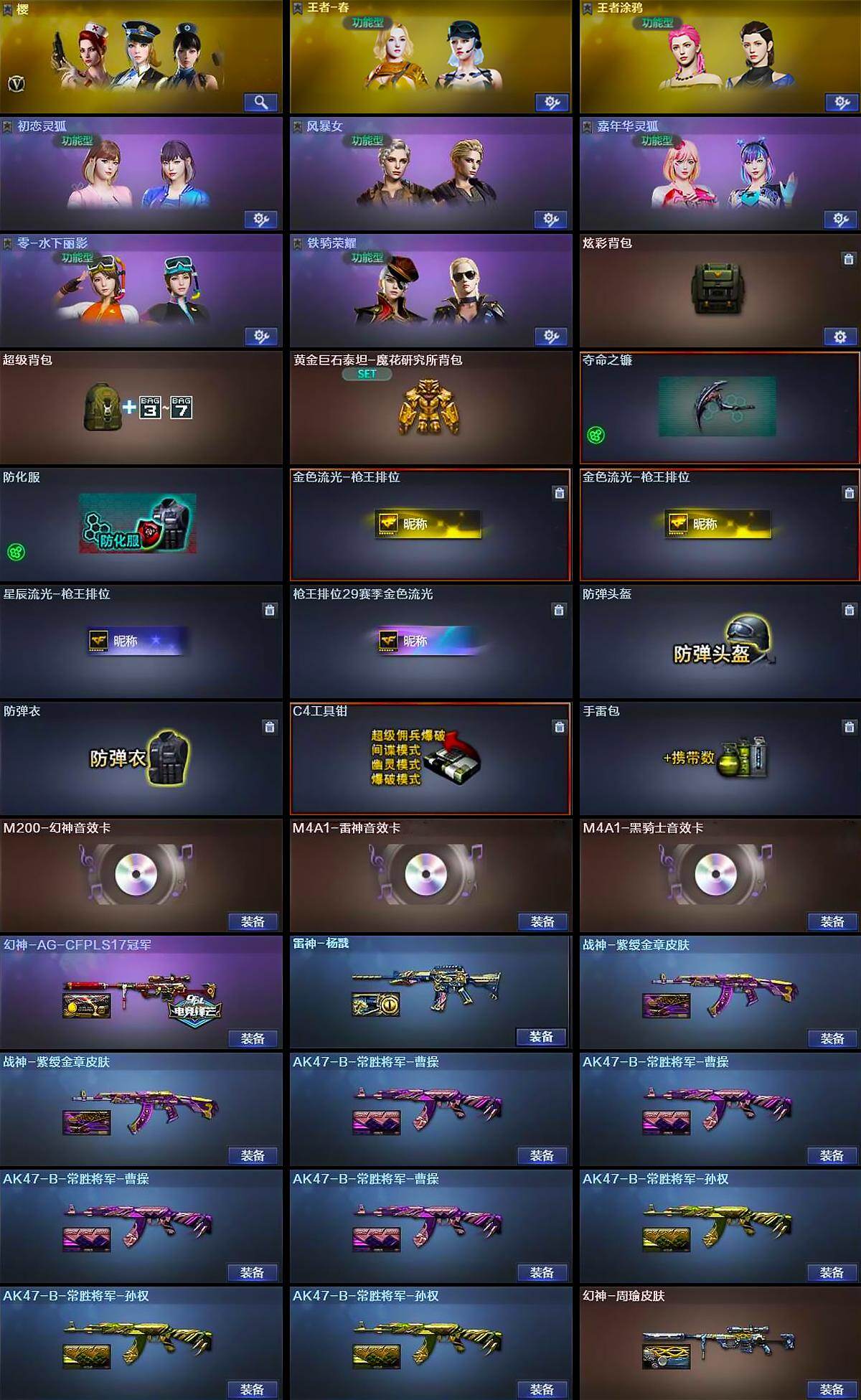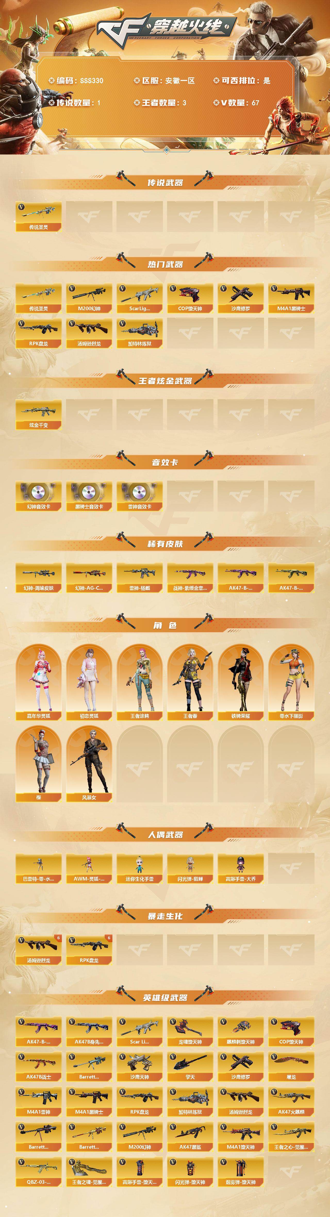 安徽一区-70V-3王者武器数-1炫金武器数【传说武器】:传说圣灵【热门武器】:传说圣灵,Scar Light-白虎,M200-幻神,M4A1-黑骑士,汤姆逊-烈龙*6,RPK-盘龙*6,加特林-炼狱,COP-堕天神*2,沙鹰-修罗*4【王者炫金武器】:炫金千变【音效卡】:M200-幻神音效卡,M4A1-雷神音效卡,M4A1-黑骑士音效卡【皮肤】:幻神-周瑜皮肤,幻神-AG-CFPLS17冠军,雷神-杨戬,战神-紫绶金章皮肤*2,AK47-B-常胜将军-曹操*4,AK47-B-常胜将军-孙权*3