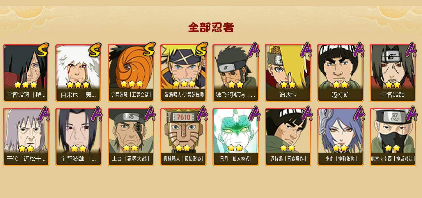 【HYC1690】V3/S忍4/A忍12/秽土转生-宇智波斑/舞之豪杰-自来也/宇智波鼬/迈特凯/2星小南「神驹佑将」/3星漩涡鸣人·宇智波佐助/夏日限定-宇智波鼬/迪达拉/秽土转生-猿飞阿斯玛/2星巳月「仙人模式」/2星迈特凯「青春爆炸」/2星土台「忍界大战」/3星宇智波斑「五影会谈」/2星机械鸣人「初始形态」/2星旗木卡卡西「神威对决」/近松十人卫-千代