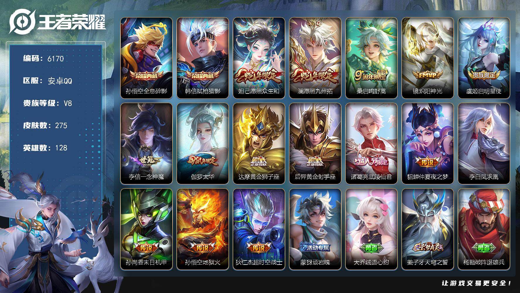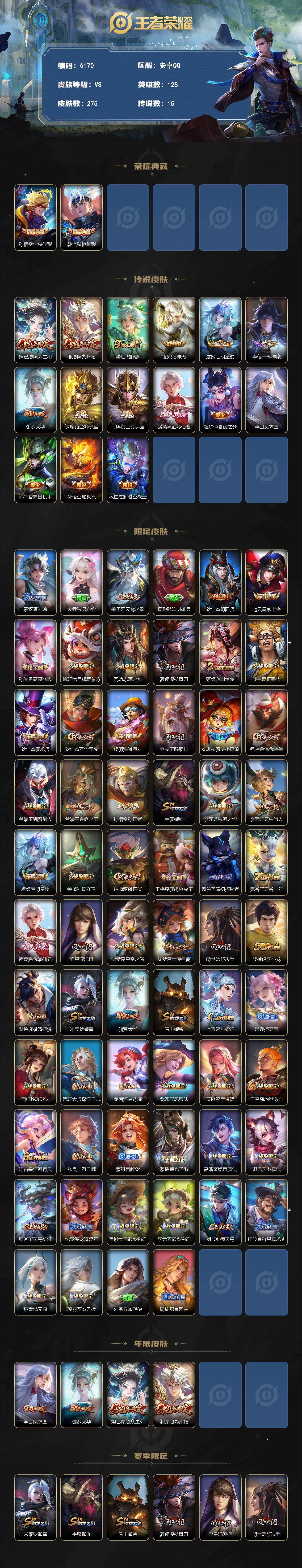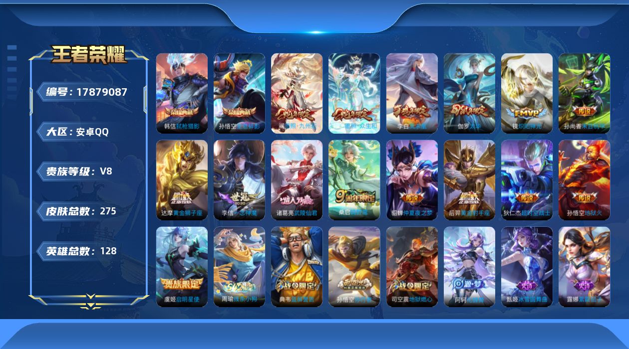 945-[17879087]贵族8-贵族积分94543-275皮2典藏15传说 安卓手Q181区275皮2典藏15传说0无双 营地ID540324818V8至尊星耀IV【荣耀典藏】:弑枪猎影,全息碎影【优质限定皮肤】:凤求凰【传说皮肤】:愿照·众生和,愿照·九州拓,鸣野蒿,炽阳神光,一念神魔,启明星使,太华,凤求凰,武陵仙君,末日机甲,超时空战士,仲夏夜之梦,黄金射手座,黄金狮子座,地狱火【史诗皮肤】:猫狗日记,化蝶舞,猫狗日记,曙光守护者,女仆咖啡,荣光圣徽,乘风破浪,心灵骇客,游园惊梦,乱