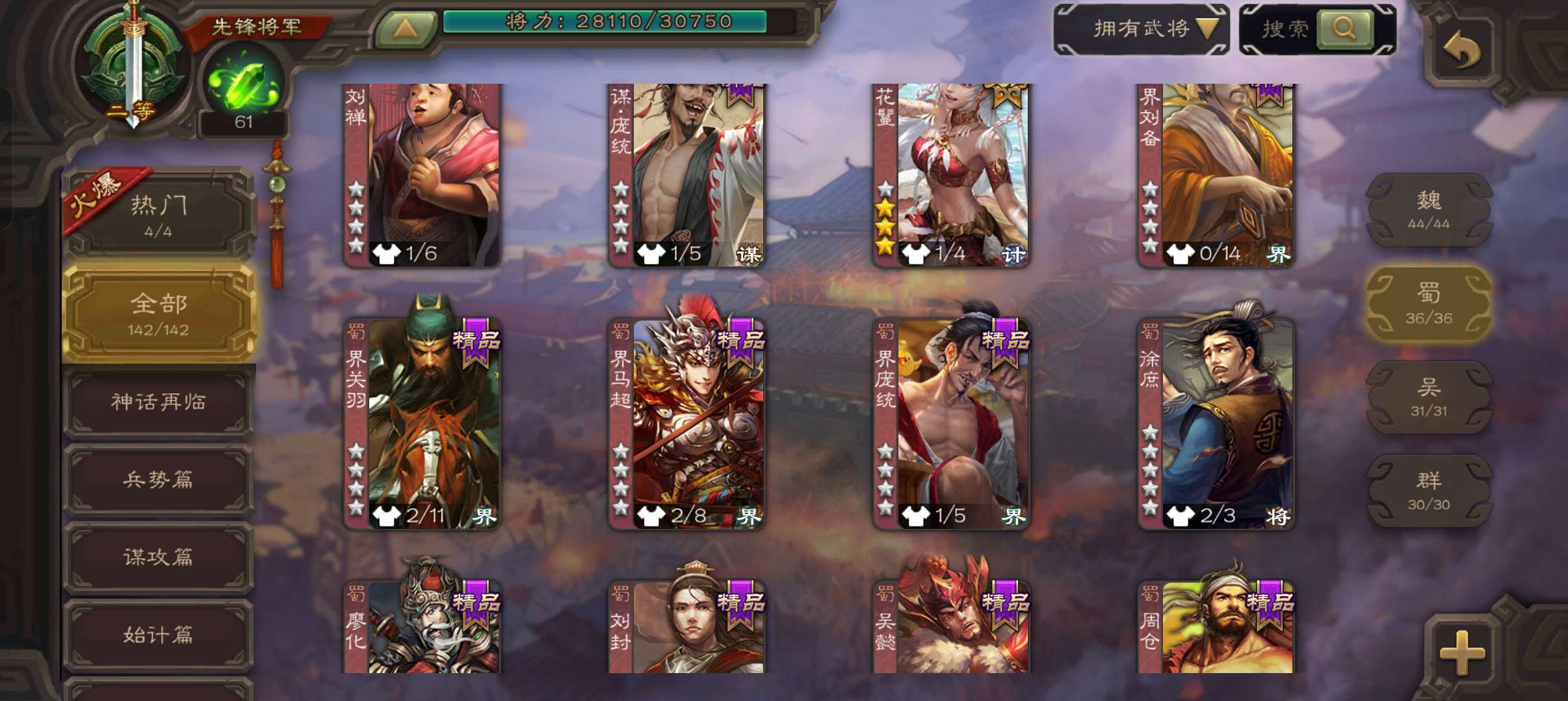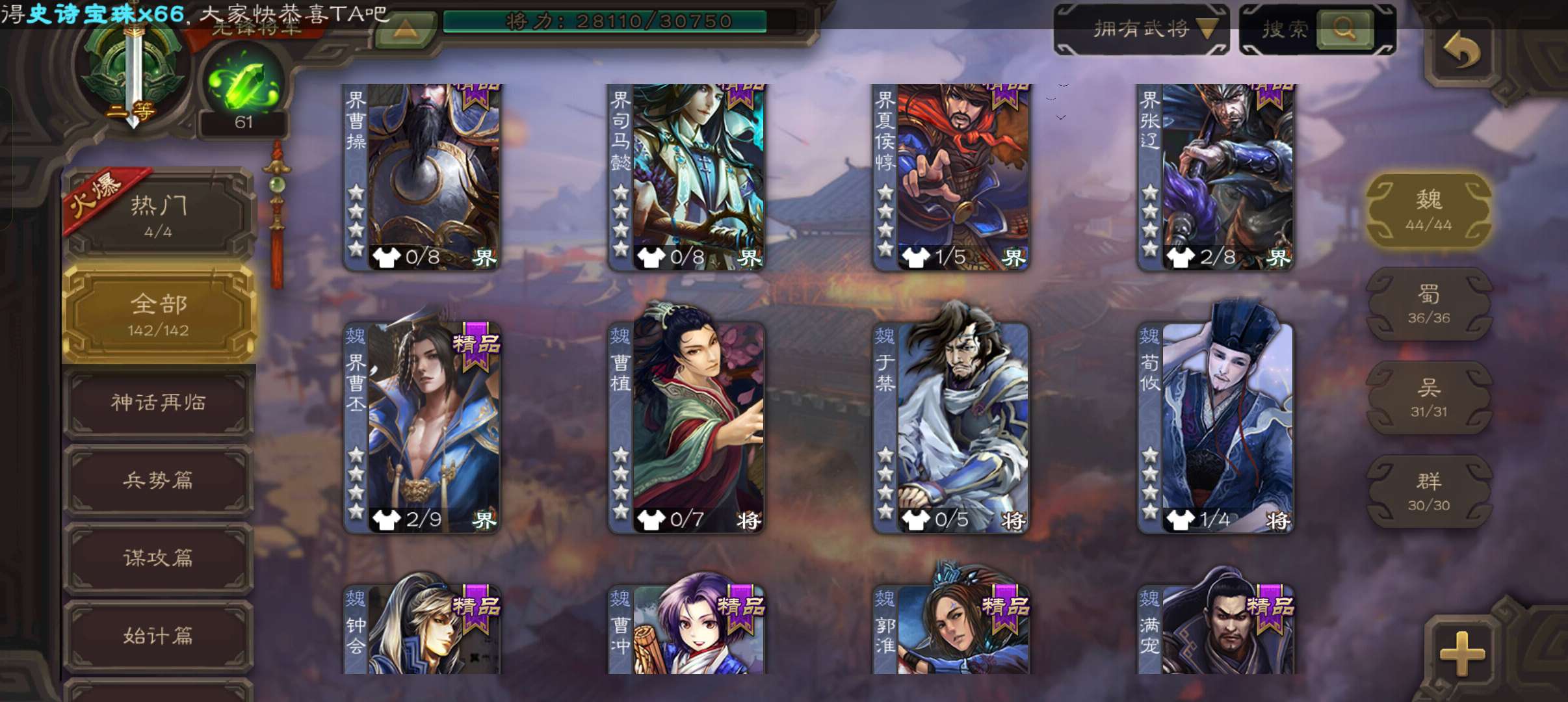 5史诗双神先锋,6万豆,天工闫象,回廊动态界李儒动态花鬘界于禁谯周沮授,神吕蒙神周瑜动界曹丕142将