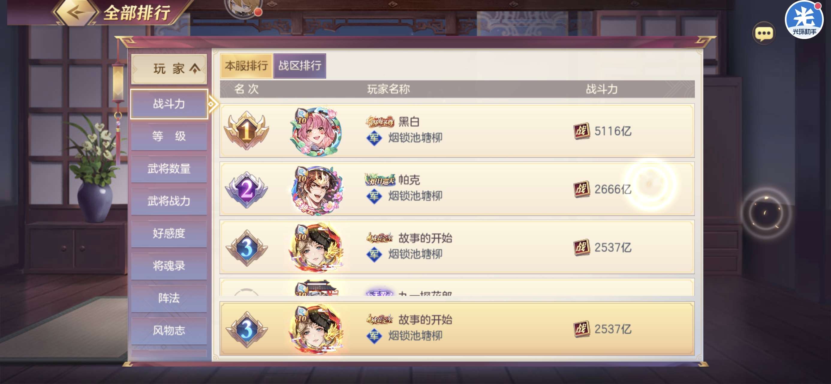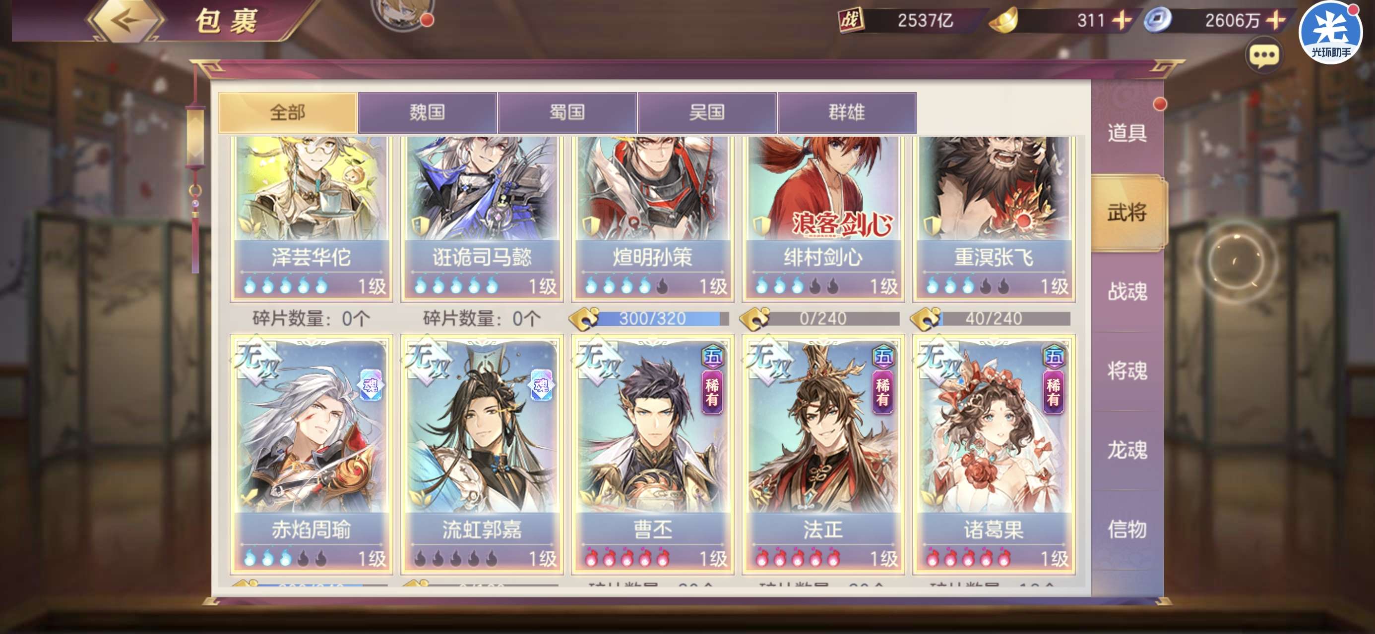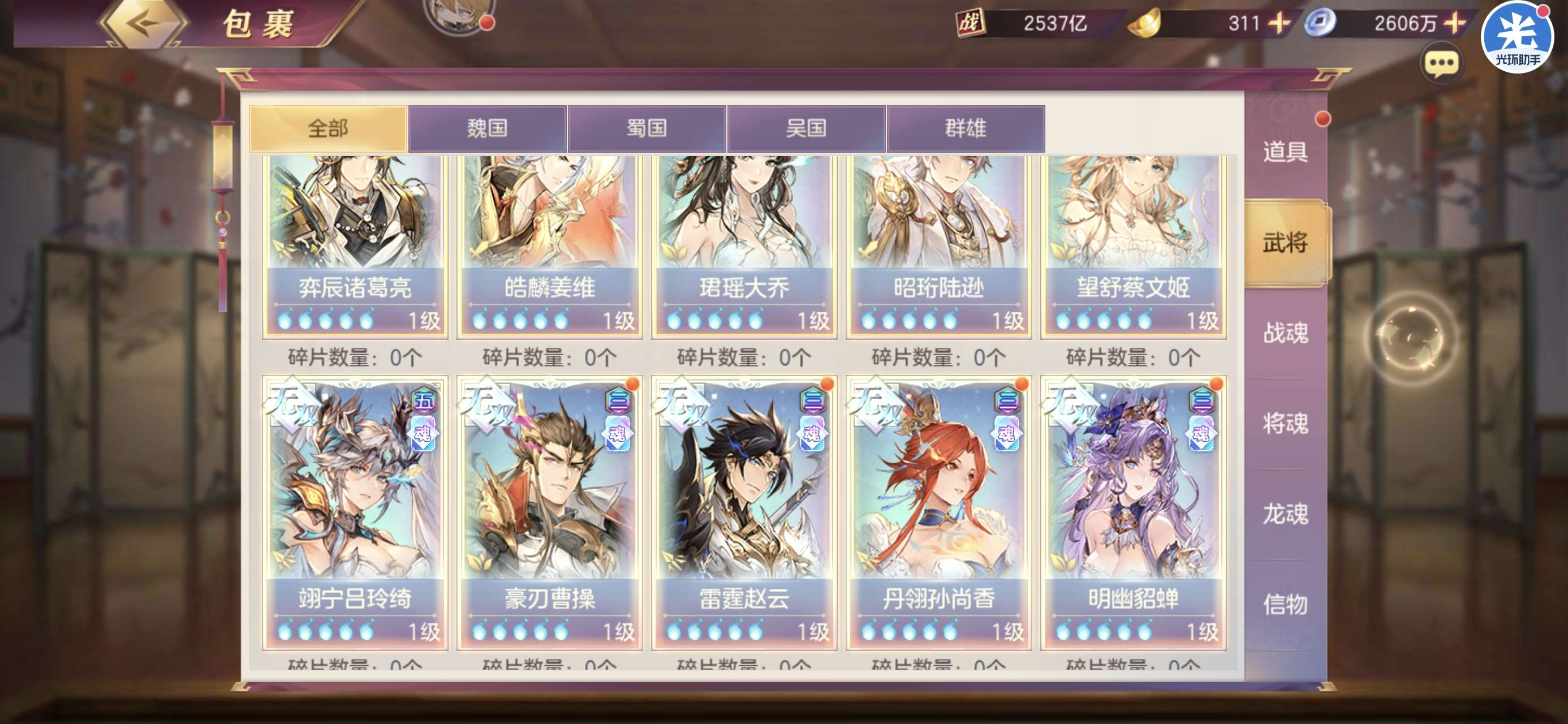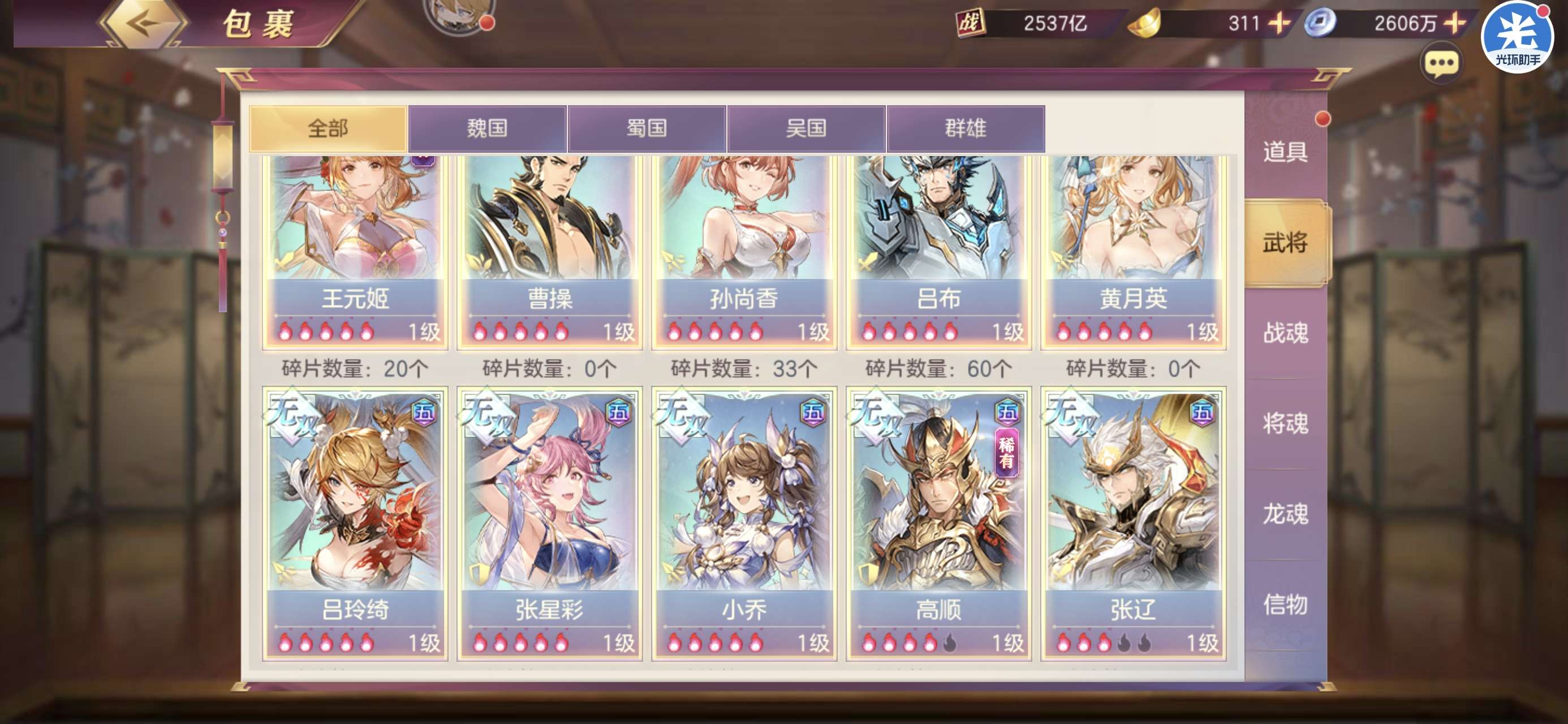 2600亿榜三。武将基本都满配。马超新皮肤已兑换。命魂基本都拉了。阵容好搭配。魅力1.2万。官服互通