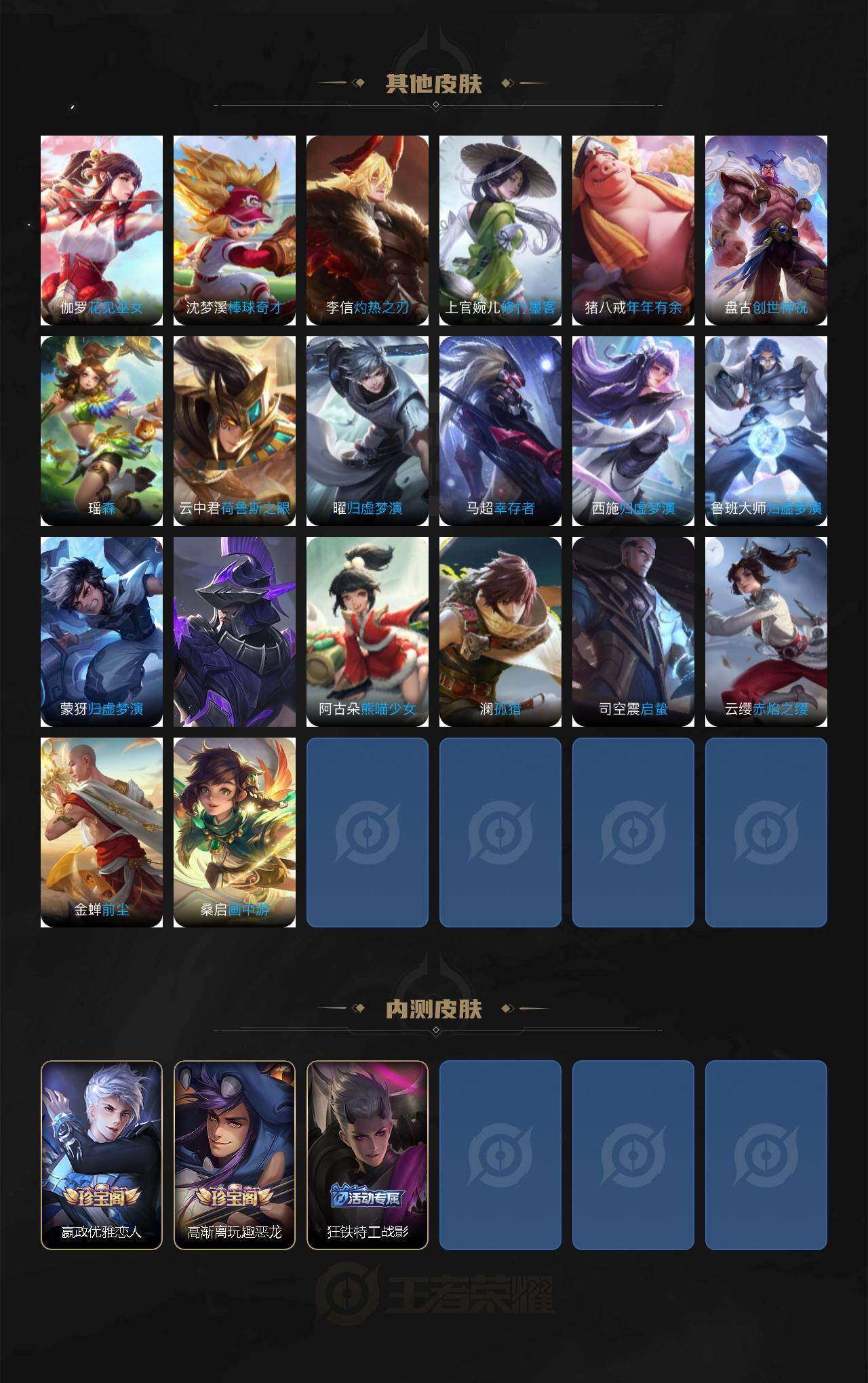 【英雄全皮】:鬼谷子全皮,狂铁全皮,李信全皮,盾山全皮,鲁班大师全皮,蒙恬全皮,阿古朵全皮