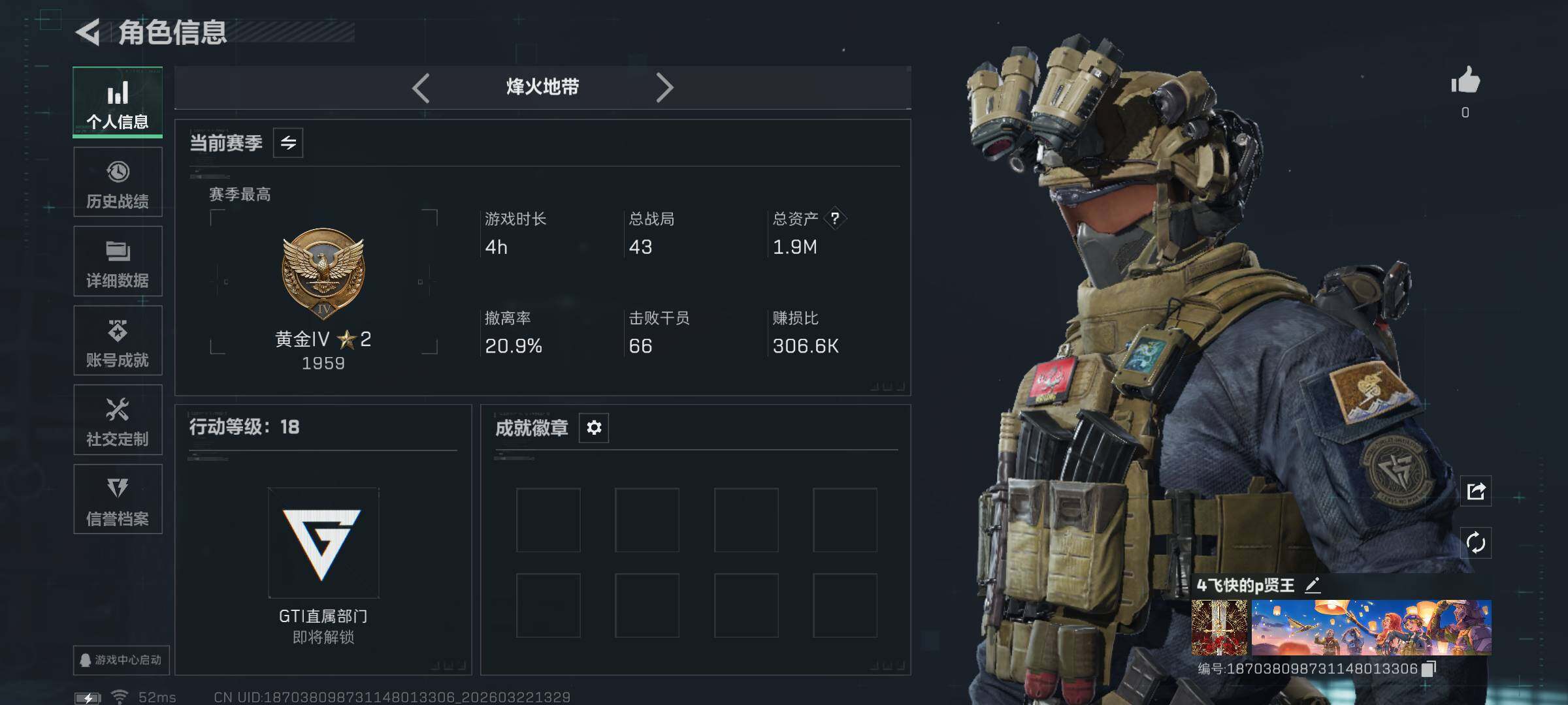 1m总资产-142k哈夫币-18烽火等级-黄金-1战场等级-无军衔
