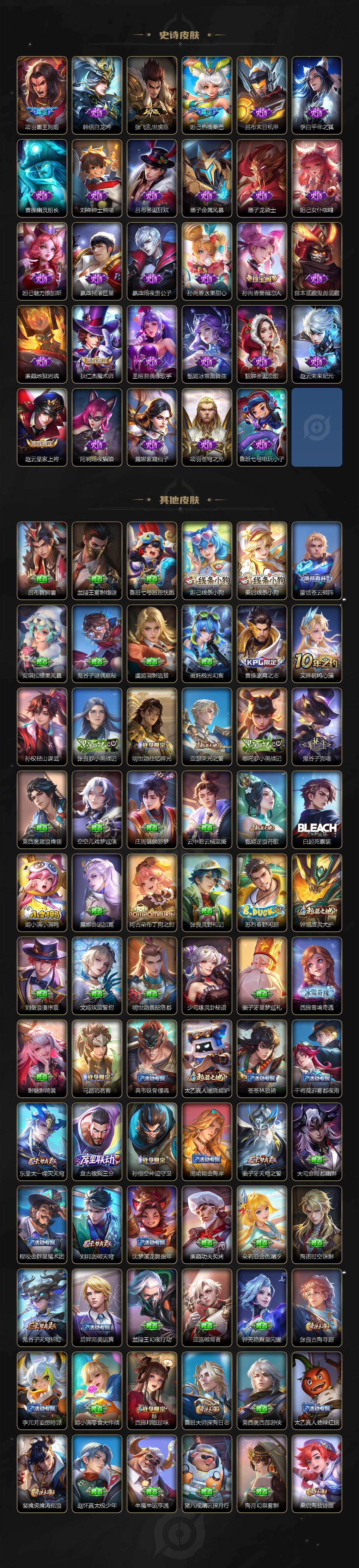 【英雄全皮】:刘邦全皮,孙权全皮,钟馗全皮,鬼谷子全皮,百里玄策全皮,猪八戒全皮,敖隐全皮,蒙恬全皮,夏洛特全皮,戈娅全皮,空空儿全皮,海诺全皮