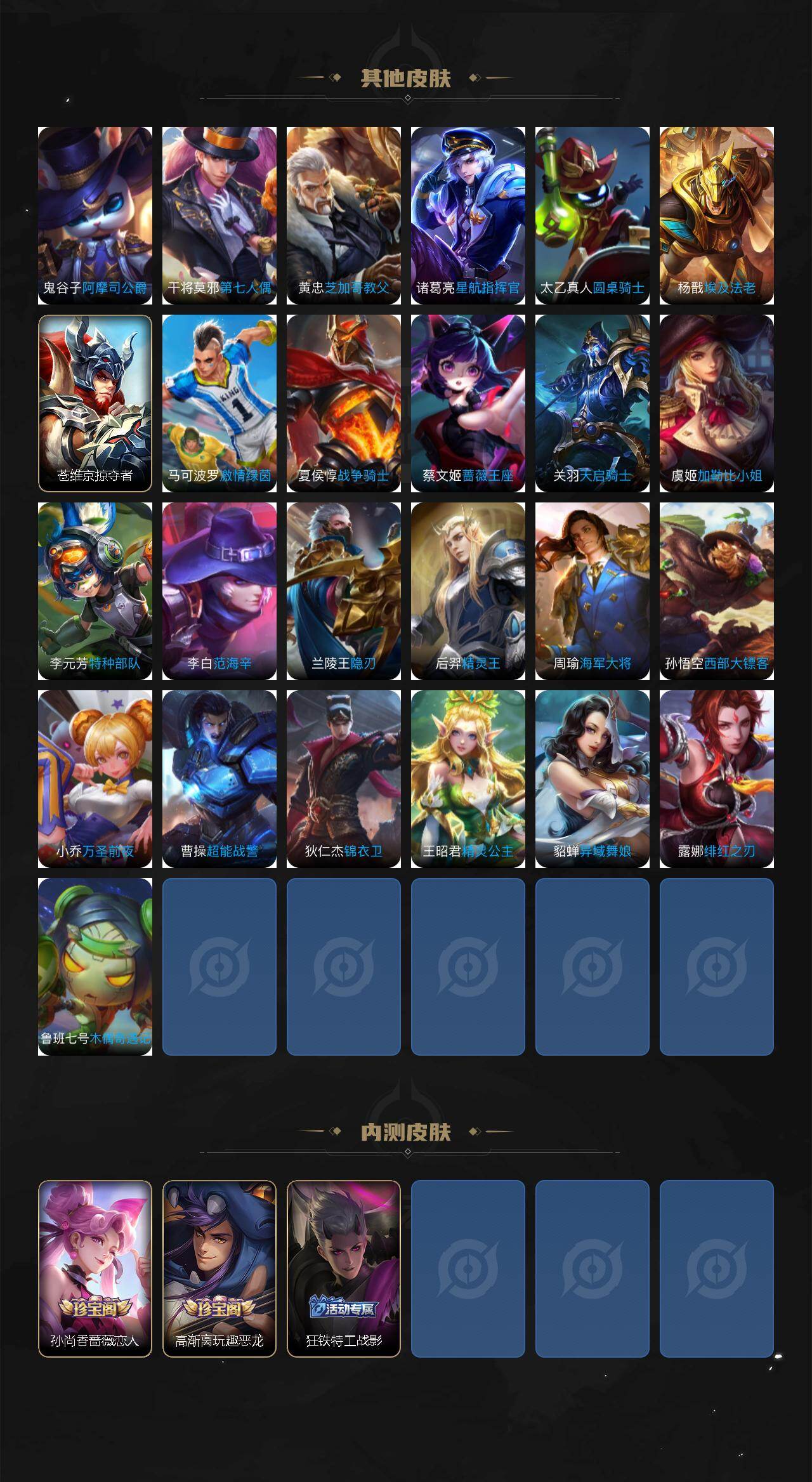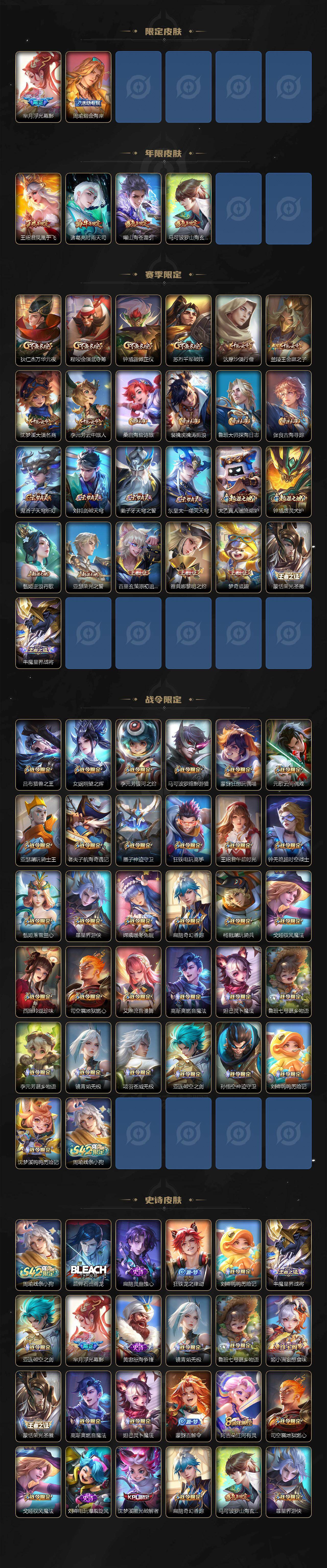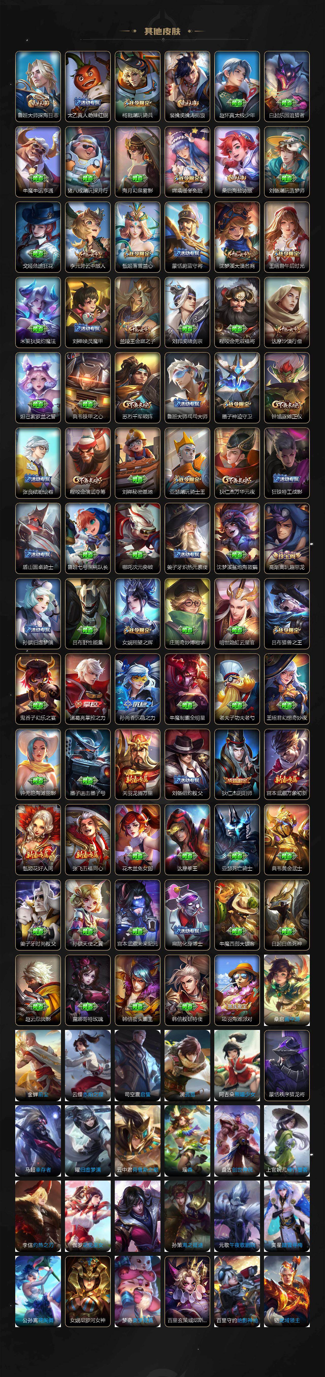 【传说皮肤】:后羿神树通天,桑启鸣野蒿,诸葛亮鹤羽星尊,曜山海苍雷引,李白诗剑行,诸葛亮时雨天司,干将莫邪久胜战神,宫本武藏地狱之眼,狄仁杰超时空战士