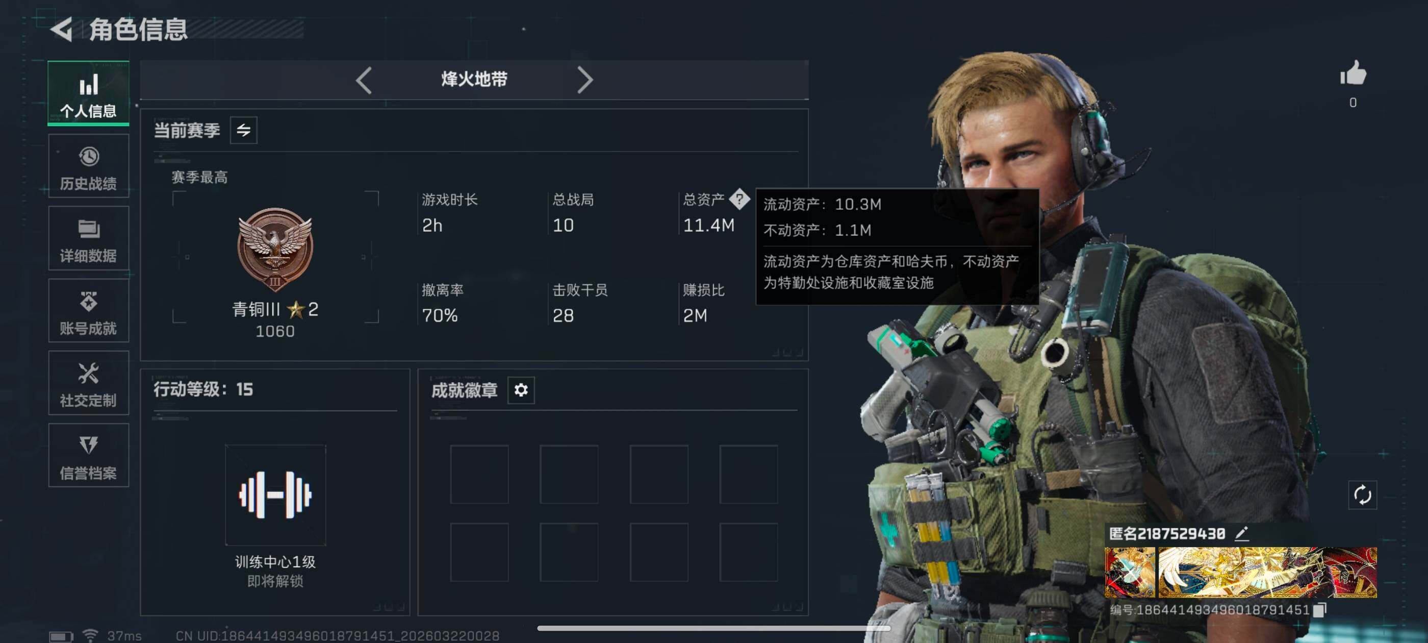 11m总资产-1546k哈夫币-15烽火等级-青铜-39战场等级-上等兵