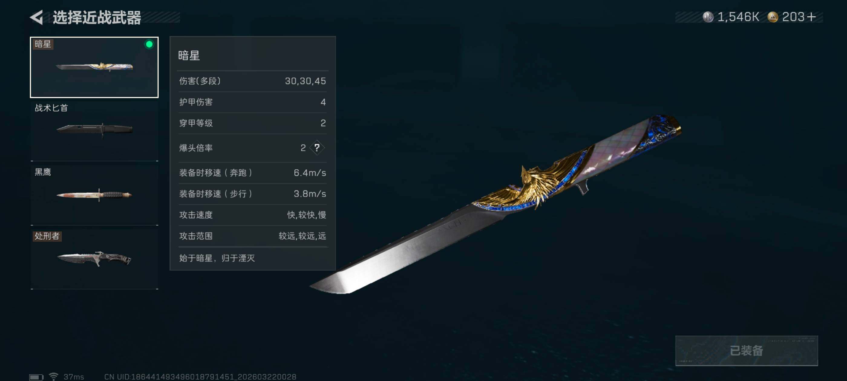 【近战皮肤】:近战-暗星,近战-处刑者1级,近战-黑鹰