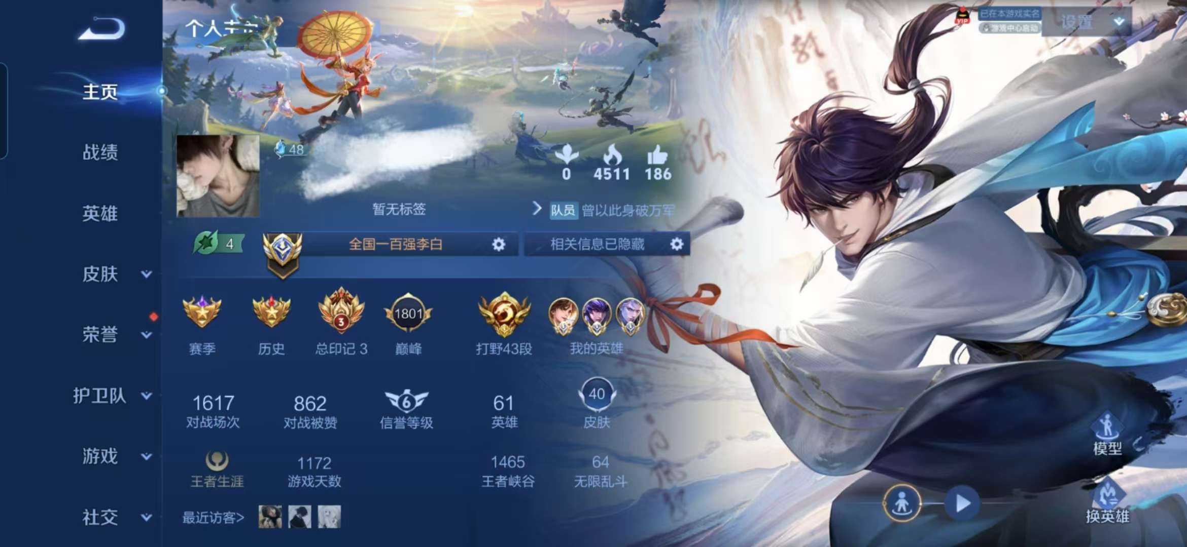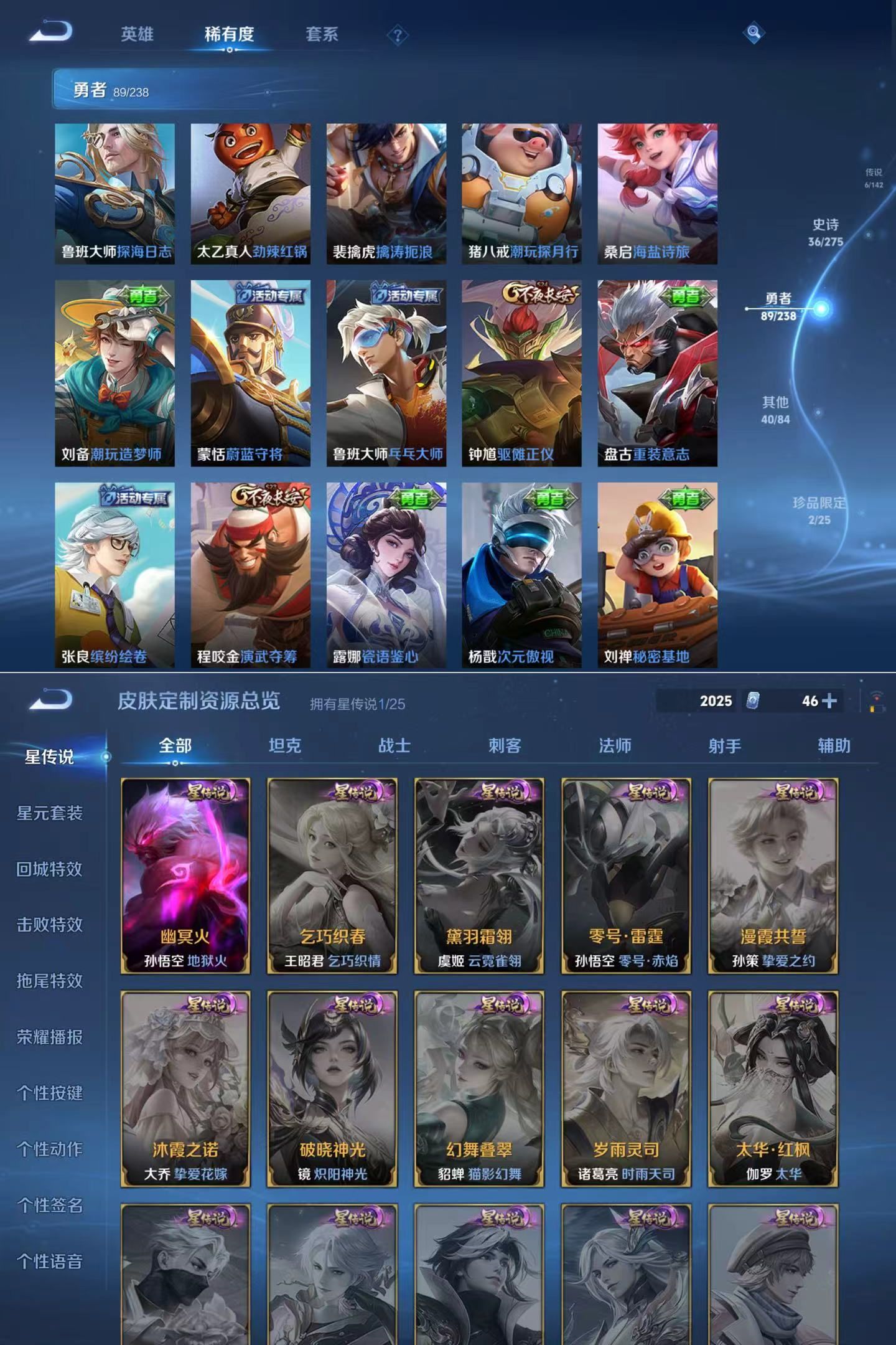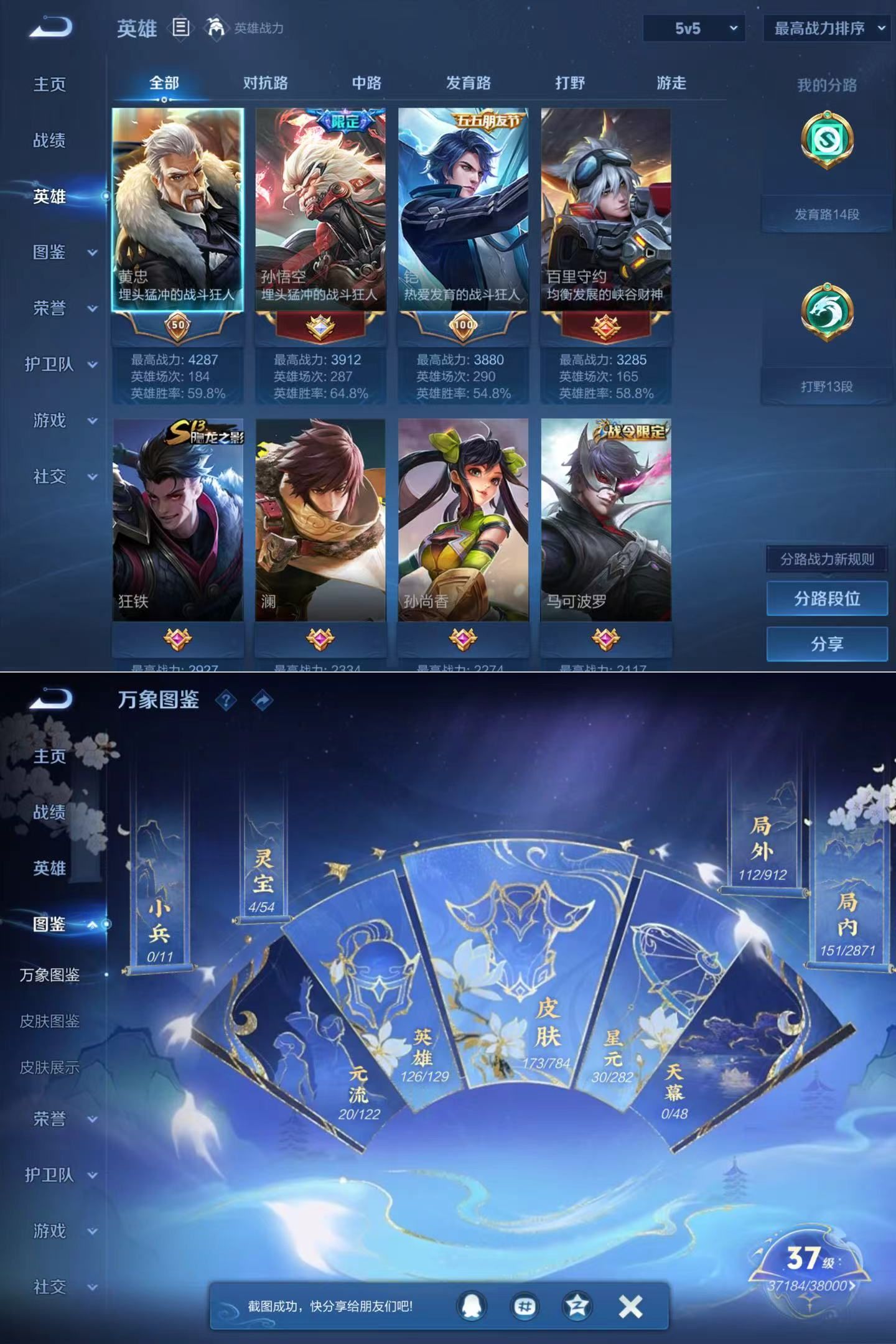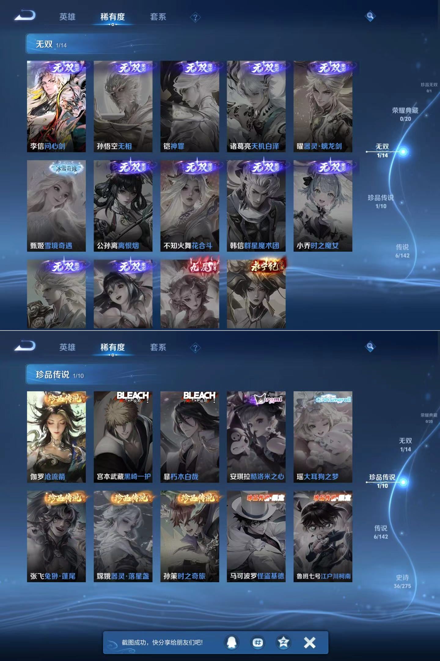 贵族7 126英雄 173皮 1无双 1珍品传说 6传说1星