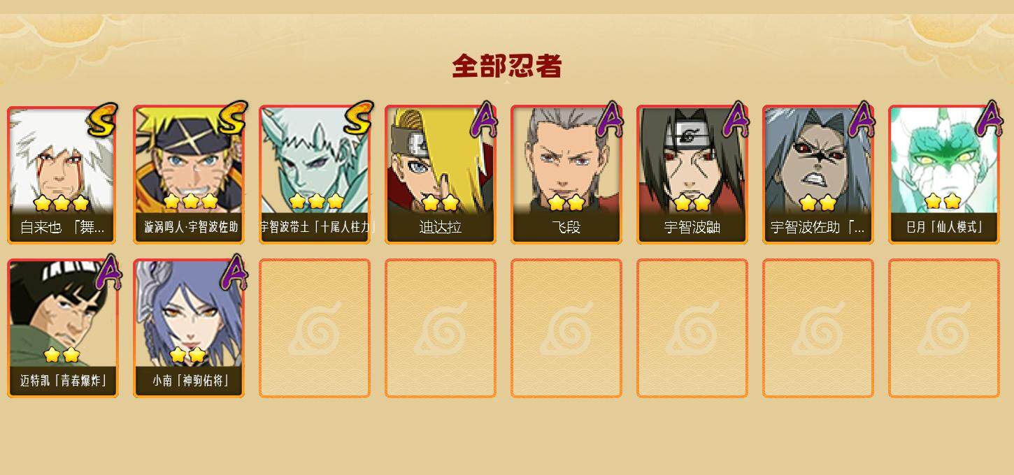 【HYYT352】V0/S忍3/A忍7/舞之豪杰-自来也/迪达拉/2星巳月「仙人模式」/3星宇智波带土「十尾人柱力」/宇智波鼬/疾风传咒印-宇智波佐助/2星迈特凯「青春爆炸」/2星小南「神驹佑将」/飞段/3星漩涡鸣人·宇智波佐助