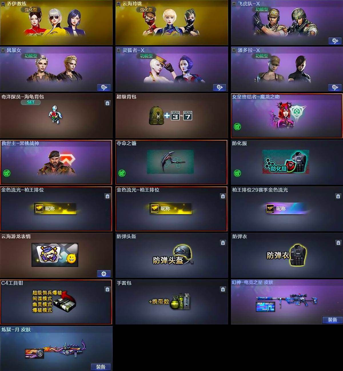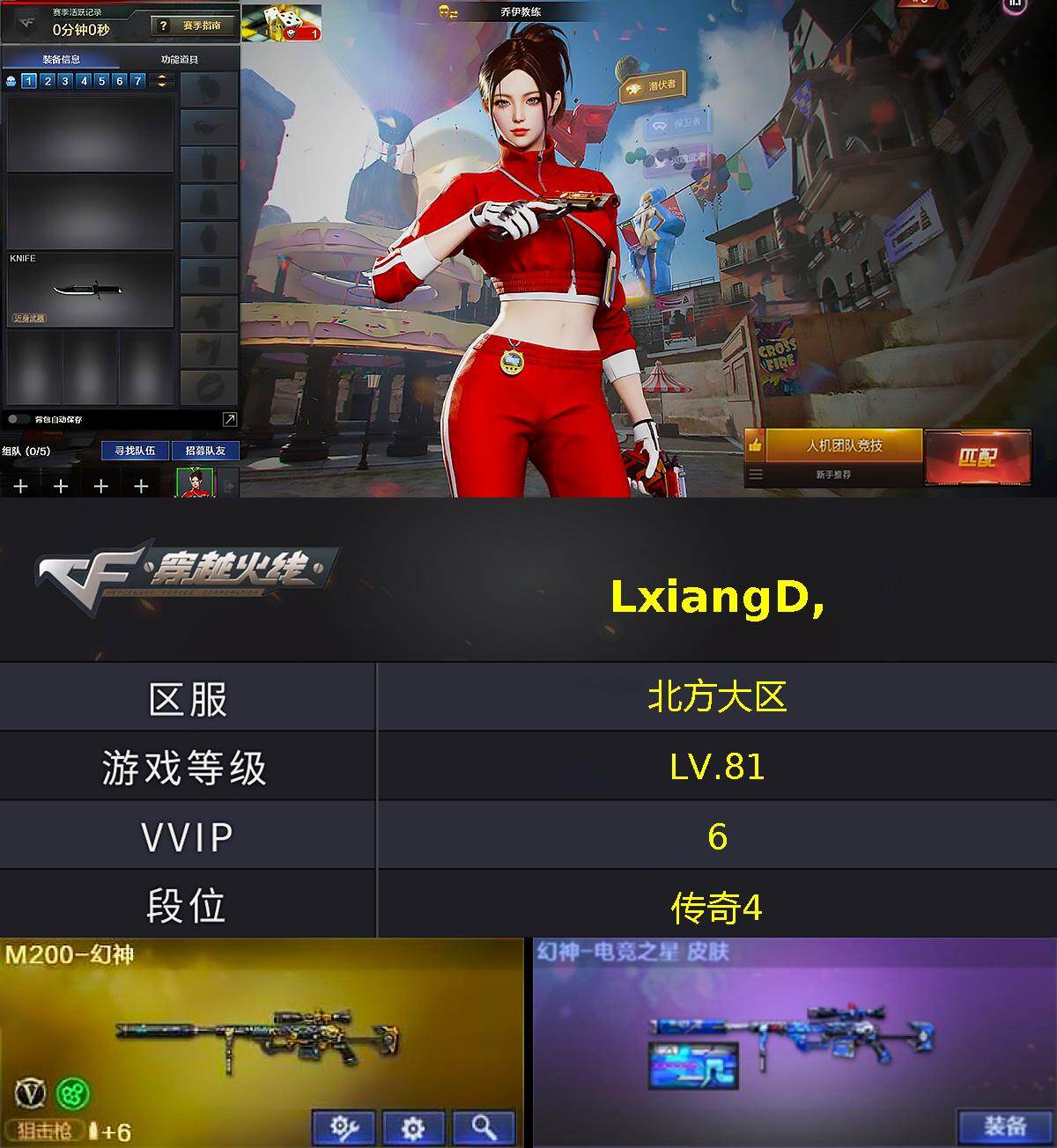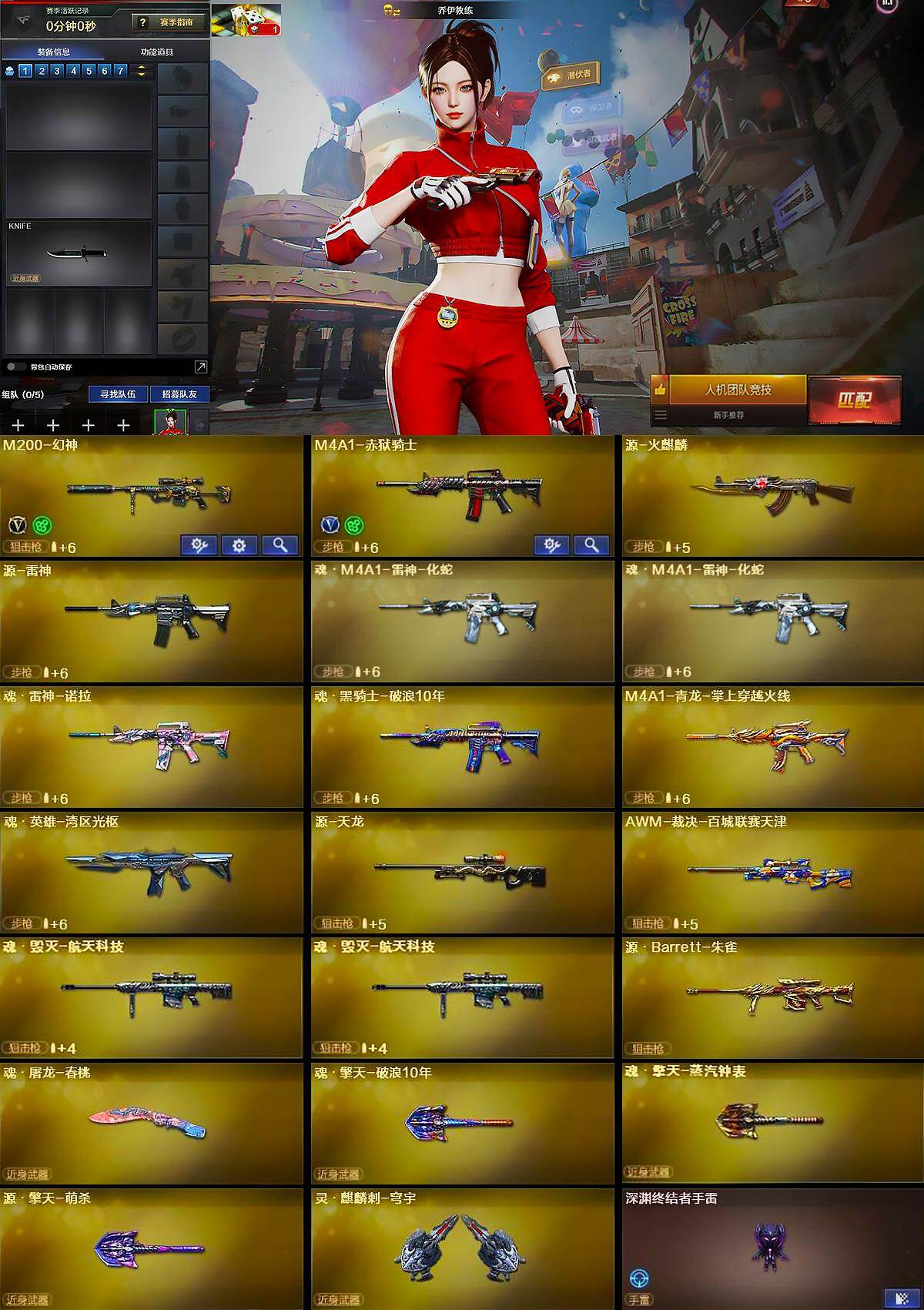 【ky5788】北方大区-7V-1王者武器数-0炫金武器数【热门武器】:M200-幻神【皮肤】:幻神-电竞之星 皮肤,炼狱-月 皮肤【角色】:乔伊教练,云海玲珑,飞虎队-X,风暴女,灵狐者-X,潘多拉-X【人偶武器】:深渊终结者手雷【英雄级武器】:M200-幻神,M4A1-赤狱骑士【道具】:奇洋探员-海龟背包,超级背包,女皇终结者-魔龙之吻,救世主-黑桃战神,夺命之镰,防化服,金色流光-枪王排位*2,枪王排位29赛季金色流光,云海游龙表情,防弹头盔,防弹衣,C4工具钳,手雷包【特殊枪械】:
