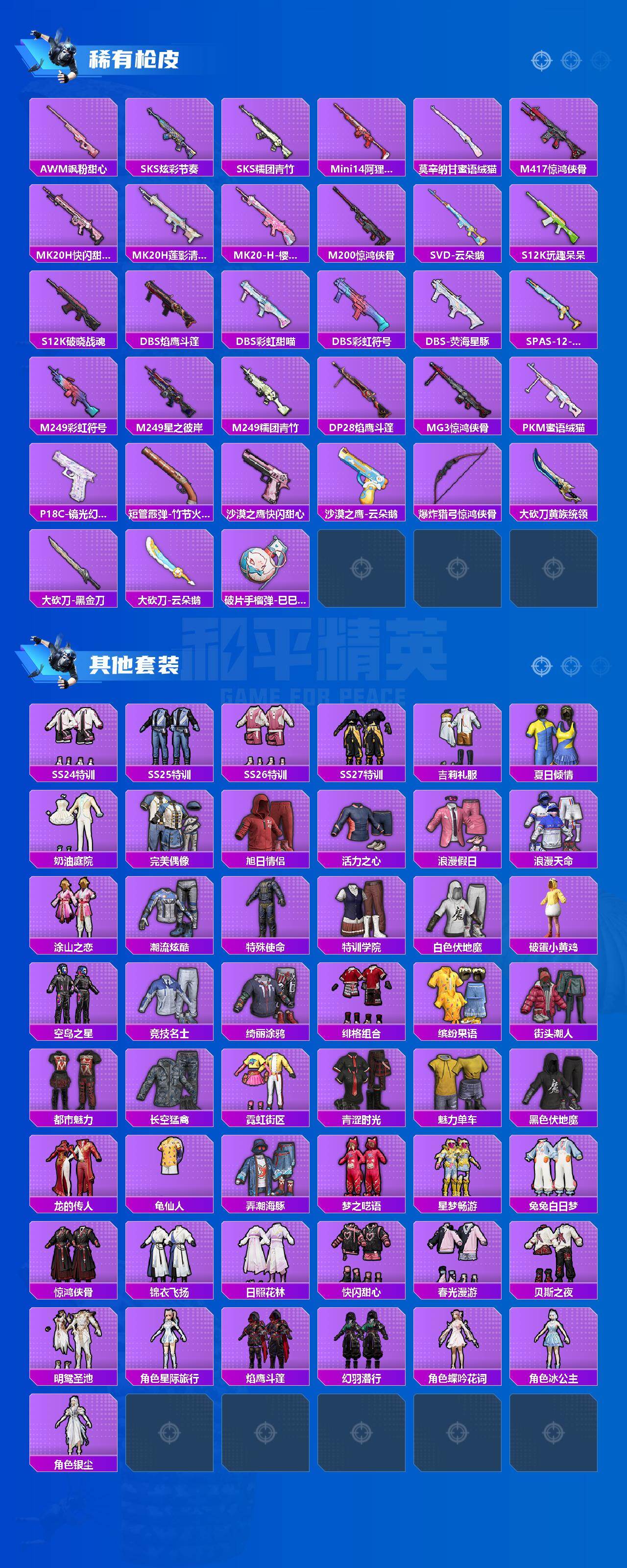 【粉色枪皮等级】:SCAR-L-锦绣绵绵(五级),AUG-暖羊咩咩(五级),UMP45-萌骑冒险(五级),Kar98K-巳巳如意(五级),Mk14-福马献瑞(五级),M417-第五大道(三