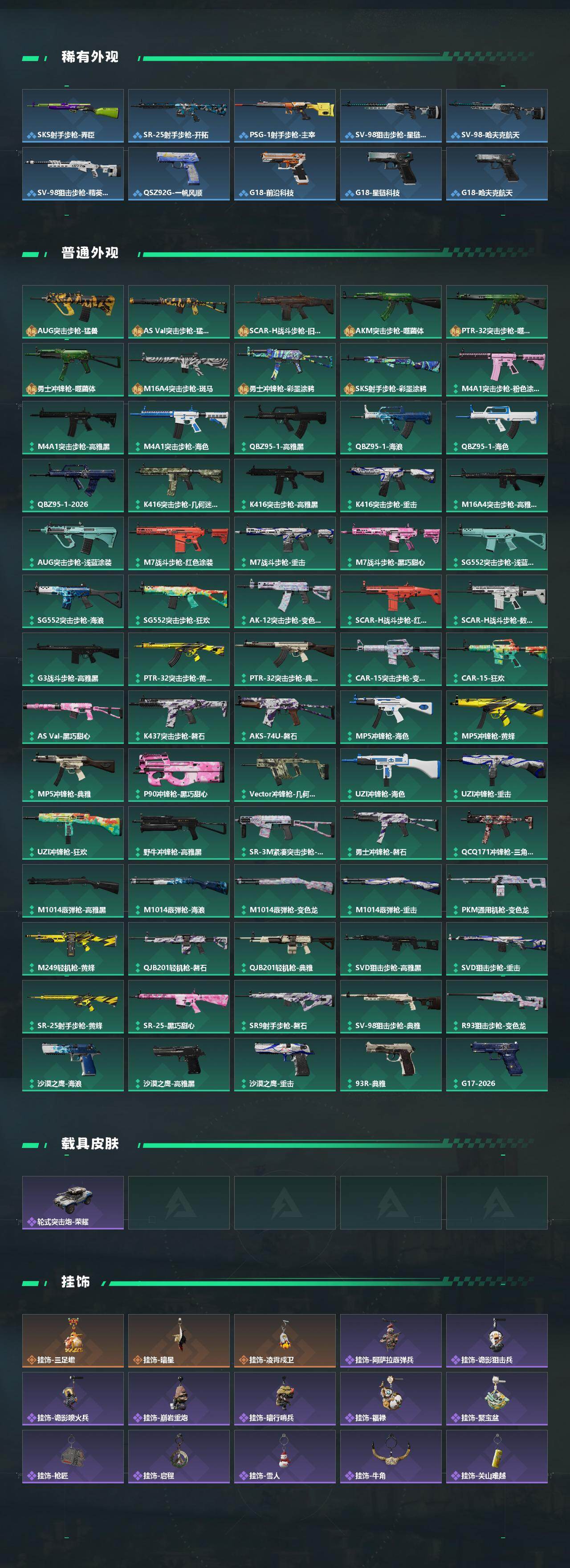 【传说外观】:QBZ95-1突击步枪-凌霄戍卫,AUG突击步枪-悠然茶歇,SG552突击步枪-运动员,SCAR-H战斗步枪-启航,MK47突击步枪-悠然茶歇,MK47突击步枪-暗星,UZI冲锋枪-悠然茶歇,SR-
