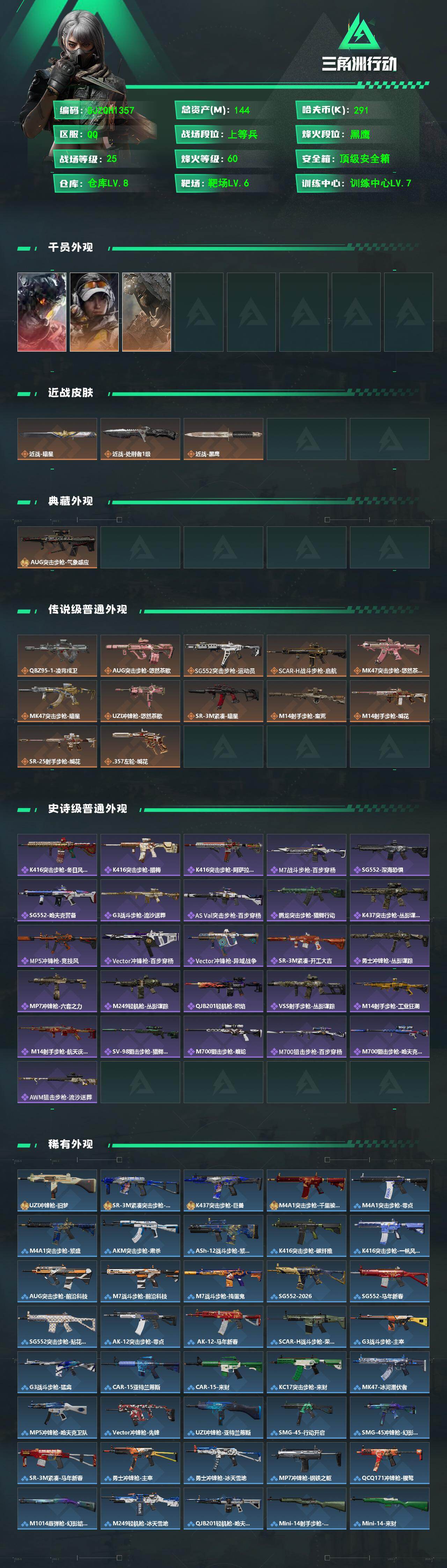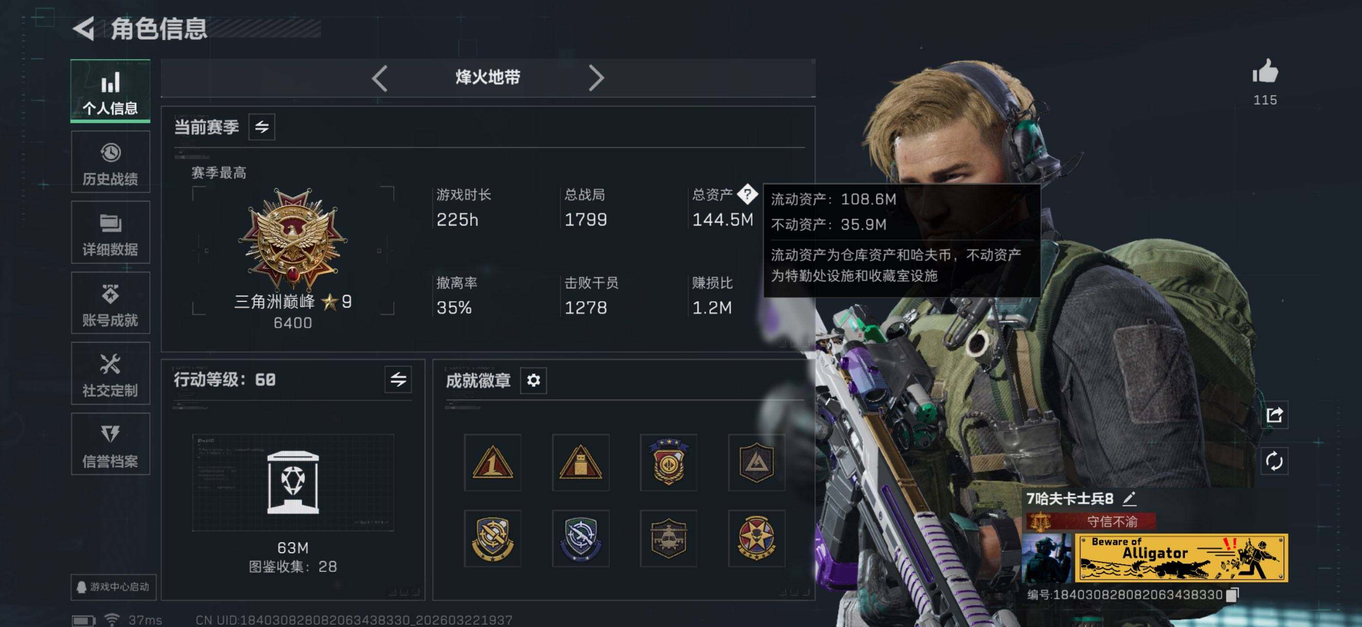 144m总资产-291k哈夫币-60烽火等级-黑鹰-25战场等级-上等兵