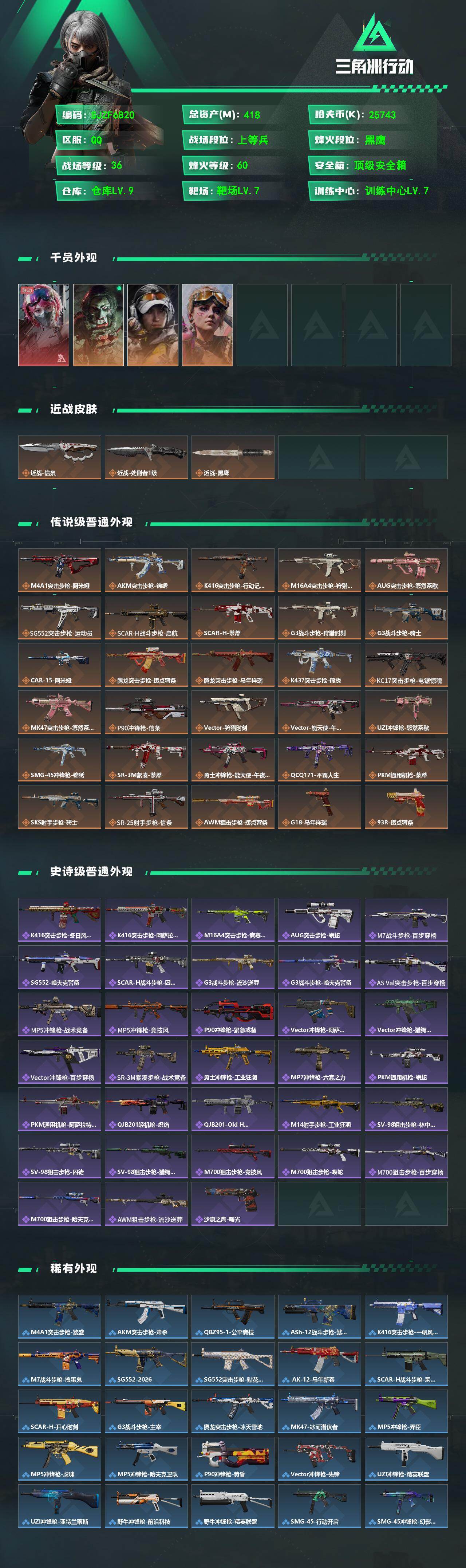 【SJZF6820】总资产(M):418M/哈夫币(K):25743K/哈夫币(K):25743K/传说枪皮数:30/全面战场等级:36_段位:上等兵/烽火地带等级:60_段位:黑鹰/零号玩家/蛊-能天使午夜邮差/红狼-电锯惊魂/露娜-金牌射手/蛊-不羁人生/近战-信条/近战-处刑者1级/近战-黑鹰/M4A1突击步枪-阿米娅/AKM突击步枪-锦绣/K416突击步枪-行动记录/M16A4突击步枪-狩猎时刻/AUG突击步枪-悠然茶歇/SG552突击步枪-运动员/SCAR-H战斗步枪-启航/SCAR-