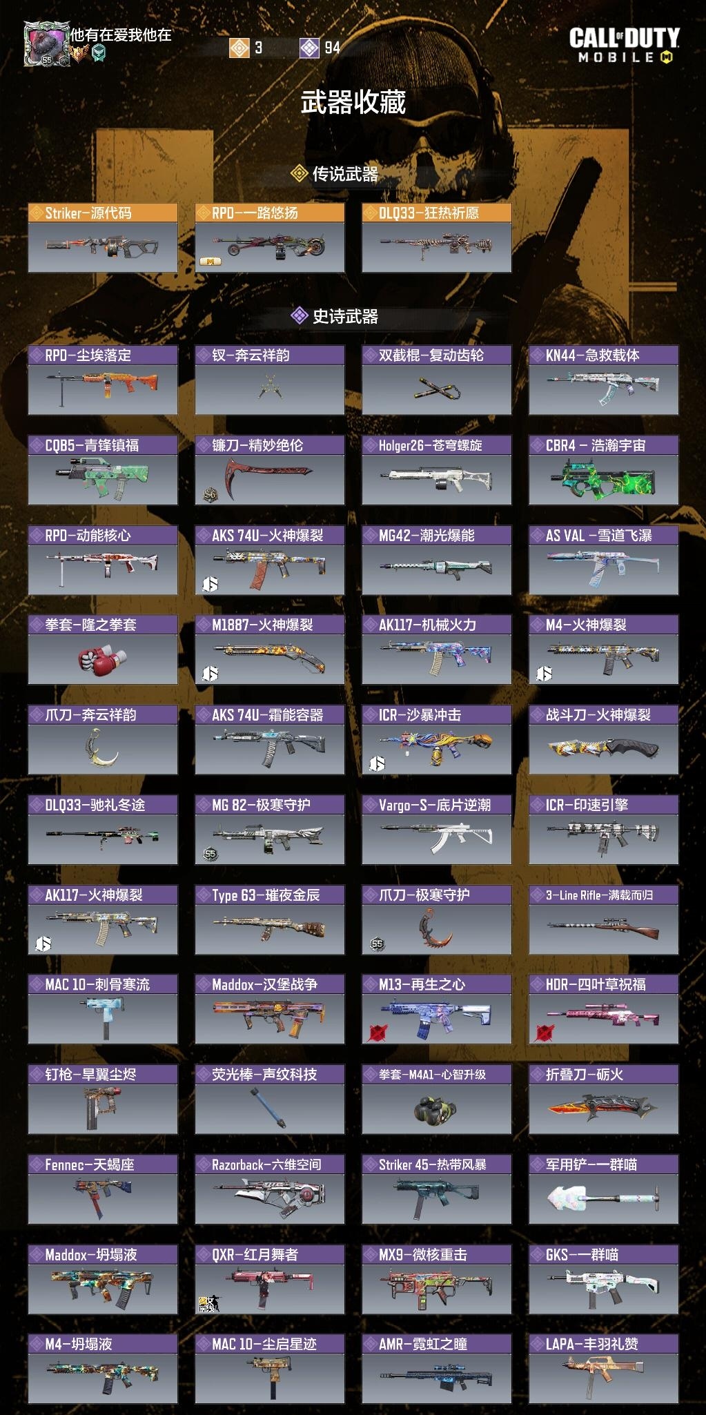 QS57 天花板账号 Striker-源代码 DLQ33-狂热祈愿 RP0--路悠扬 3太阳 QS57 包人脸 安全提醒【安q-等级191-神话枪皮0-神话角色0-传说枪皮3-传说角色0-传说载具0-钻石皮-紫枪94-角色26-载具58】传说武器:Striker-源代码 DLQ33-狂热祈愿 RP0--路悠扬