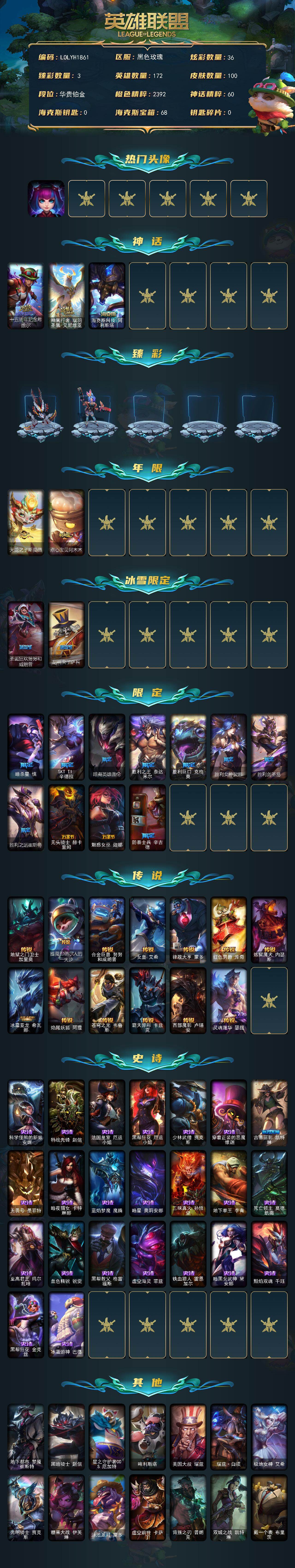 172英雄/100皮肤/3神话/16限定/3臻彩/36炫彩/1