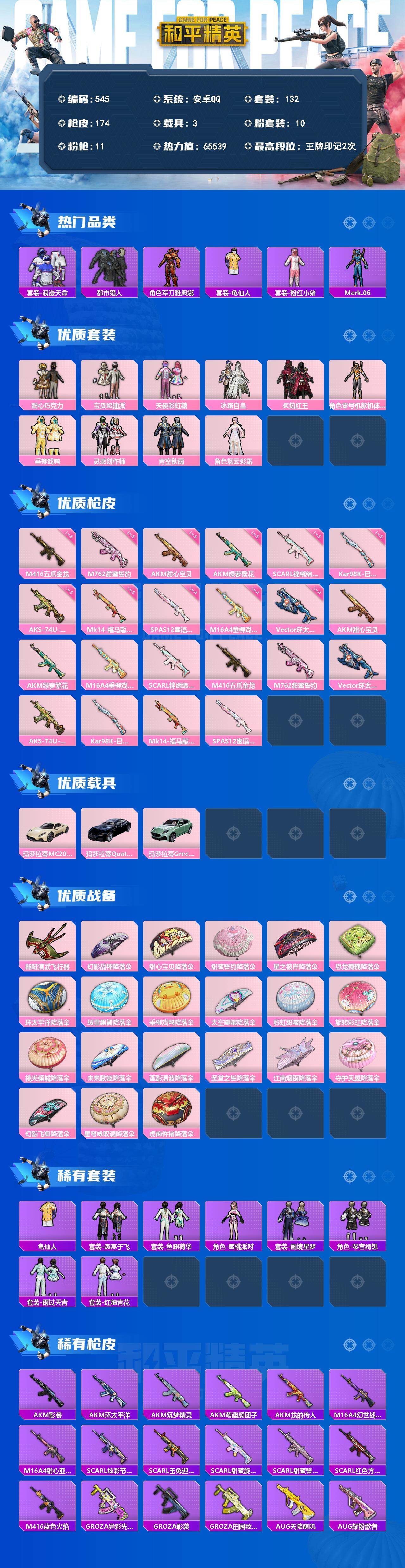 安卓 手Q-10粉装-11特效枪-3载具-1粉色飞行器-65539热力值-2王牌印记-132套装-174枪皮