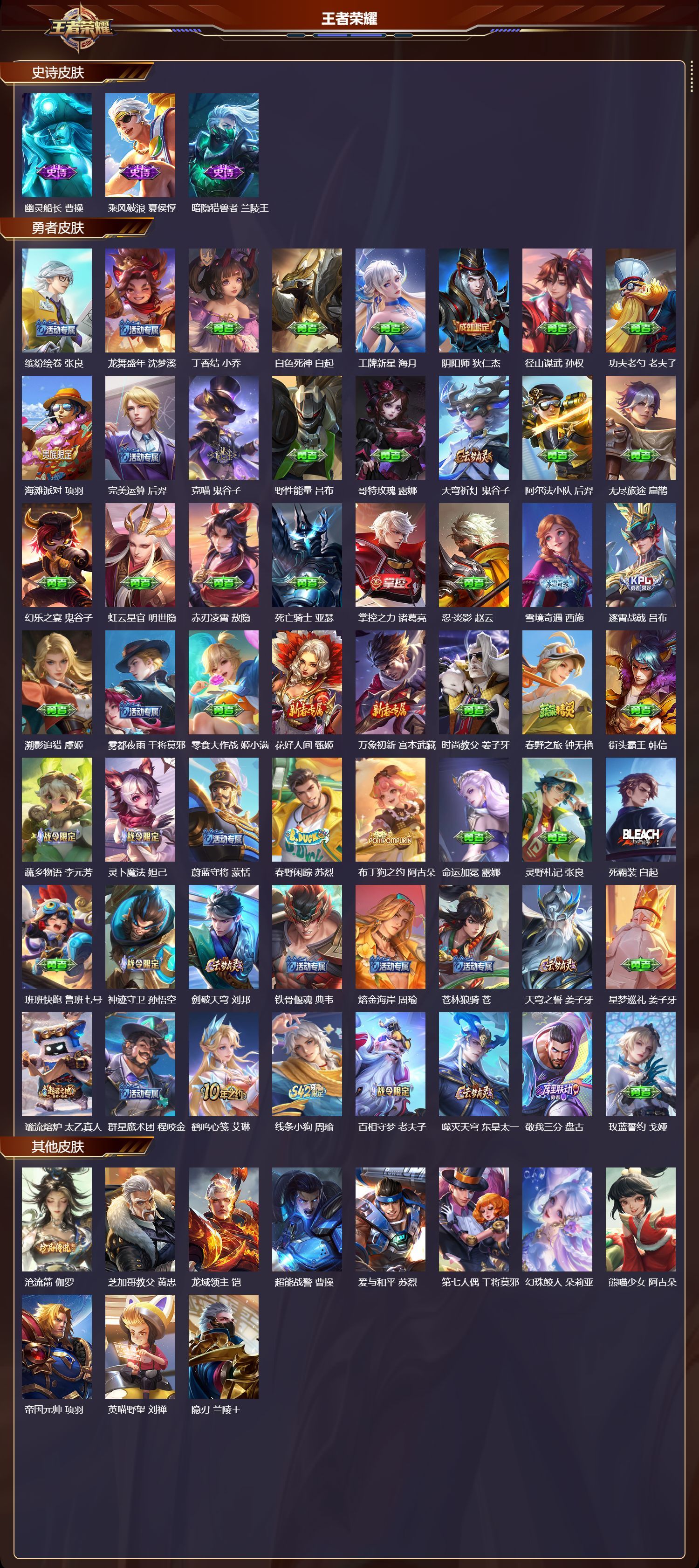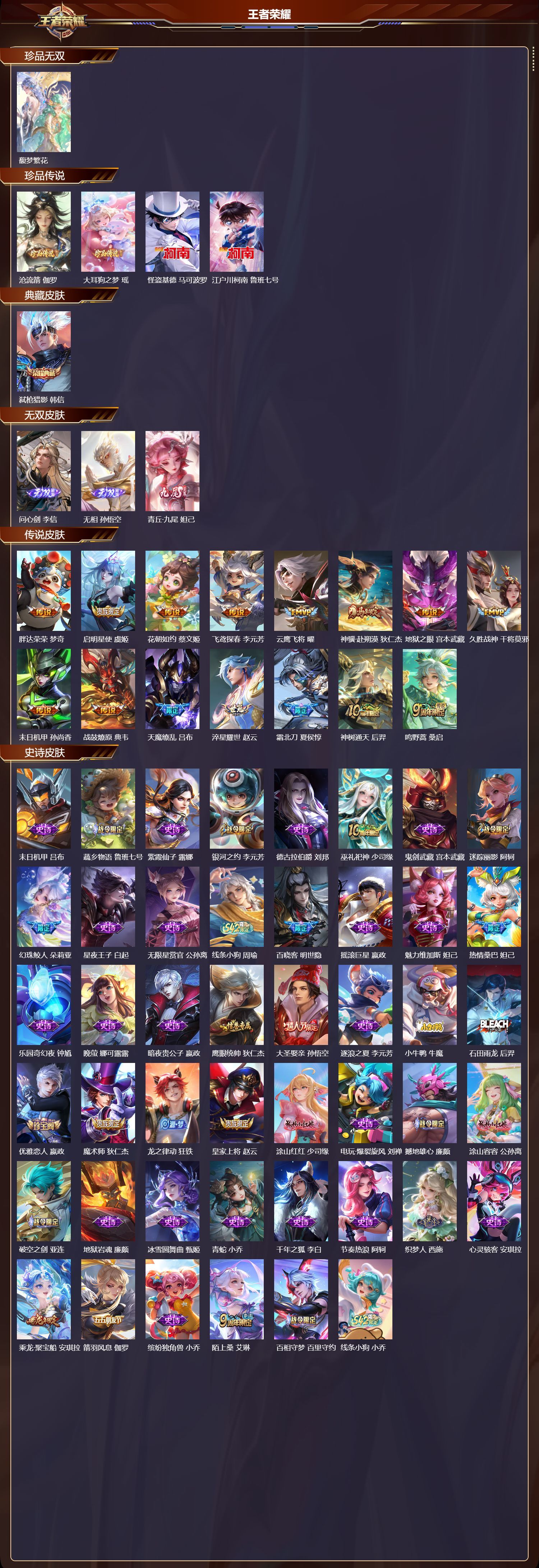 安卓QQ/至圣王者/150皮肤/111英雄/1典藏/1珍品无双/3无双/4珍品传说/15传说/49史