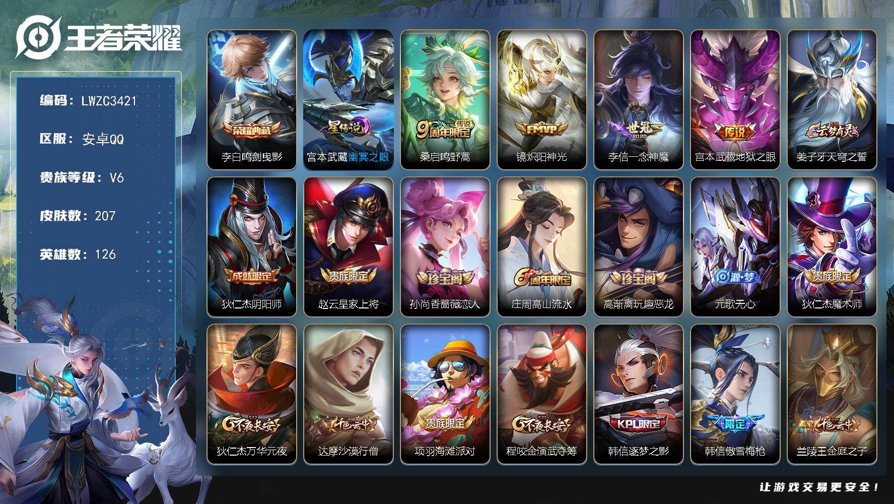 【特价急出/详情看图】安卓Q-V6-最强王者段位-126英雄-207皮肤-1典藏皮肤-1星元-4传说-50史诗【荣耀典藏】:李白鸣剑曳影【传说皮肤】:桑启鸣野蒿,镜炽阳神光,李信一念神魔,宫本武藏地狱之眼【限定皮肤】:姜子牙天穹之誓,狄仁杰阴阳师,赵云皇家上将,孙尚香蔷薇恋人,庄周高山流水,高渐离玩趣恶龙,元歌无心,狄仁杰魔术师,狄仁杰万华元夜,达摩沙漠行僧,项羽海滩派对,程咬金演武夺筹,韩信逐梦之影,韩信傲雪梅枪,兰陵王金庭之子,李元芳云中旅人,钟馗驱傩正仪,雅典娜黎明之约,鬼谷子五谷丰年,苏