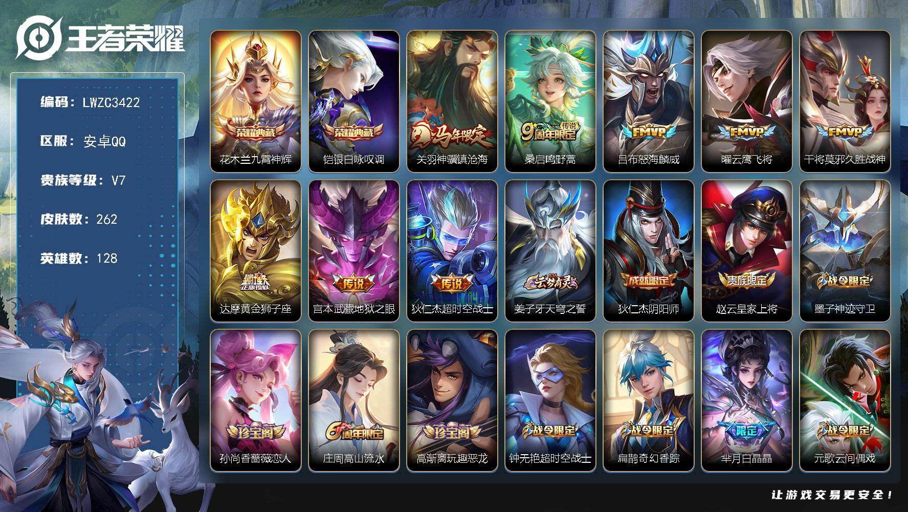 安卓Q-V7-最强王者段位-128英雄-262皮肤-2典藏皮肤-8传说-75史诗【英雄全皮】:敖隐全皮【荣耀典藏】:花木兰九霄神辉,铠银白咏叹调【传说皮肤】:关羽神骥镇沧海,桑启鸣野蒿,吕布怒海麟威,曜云鹰飞将,干将莫邪久胜战神,达摩黄金狮子座,宫本武藏地狱之眼,狄仁杰超时空战士【限定皮肤】:姜子牙天穹之誓,狄仁杰阴阳师,赵云皇家上将,墨子神迹守卫,孙尚香蔷薇恋人,庄周高山流水,高渐离玩趣恶龙,钟无艳超时空战士,扁鹊奇幻香踪,芈月白晶晶,元歌云间偶戏,元歌无心,甄姬落雪兰心,狄仁杰魔术师,狄仁杰