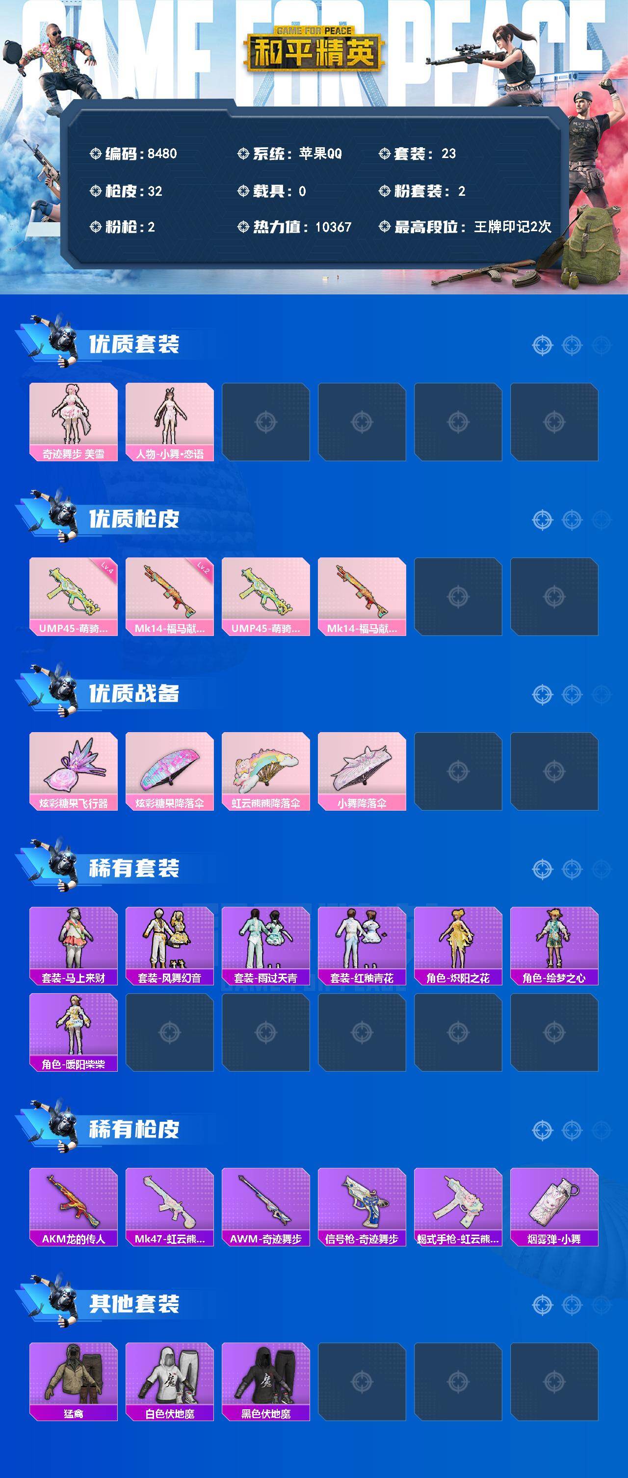【8480】2粉装-2特效枪-0载具-1粉色飞行器-10367热力值-2王牌印记-23套装-32枪皮