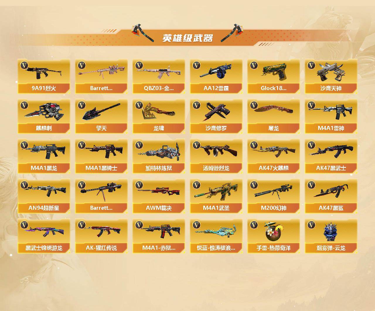 【热门武器】:QBZ03-金色蔷薇,M200-幻神,死亡之眼*3,C.A.T,M4A1-黑骑士,汤姆逊-烈龙*6,加特林-炼狱*2,沙鹰-修罗*2