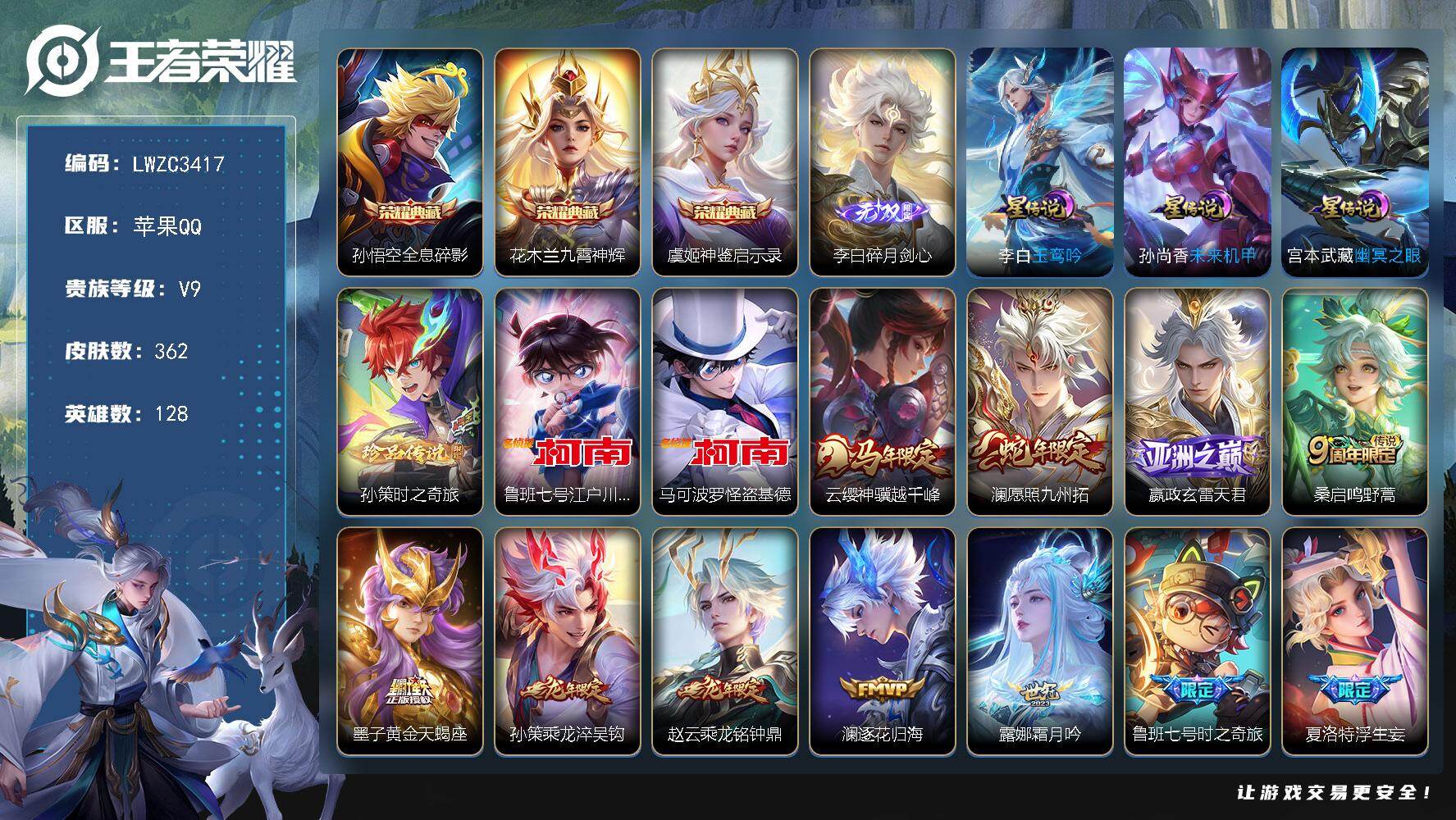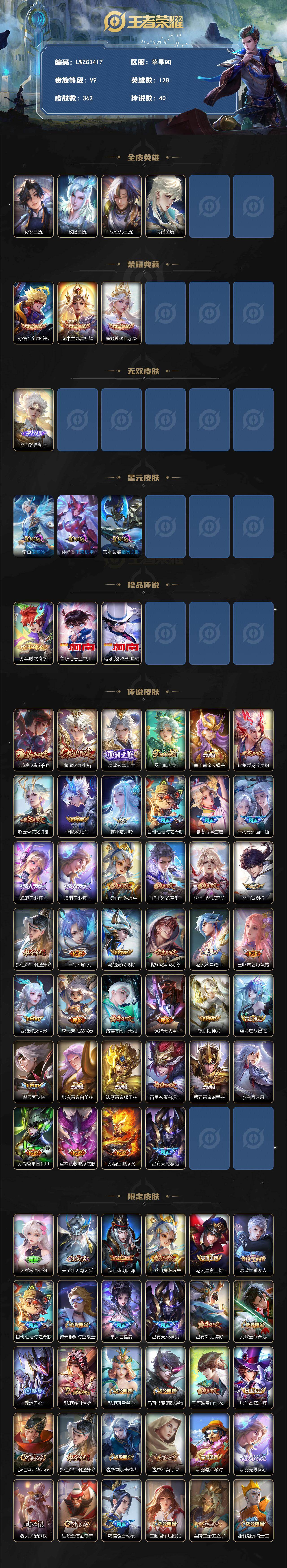 【特价出售/店主推荐/不包人脸】发育路34段、打野30段,苹果Q-V9-最强王者段位-128英雄-362皮肤-3典藏皮肤-1无双-3珍品传说-3星传说-40传说-103史诗【英雄全皮】:孙权全皮,敖隐全皮,空空儿全皮,海诺全皮【荣耀典藏】:孙悟空全息碎影,花木兰九霄神辉,虞姬神鉴启示录【无双皮肤】:李白碎月剑心【珍品传说】:孙策时之奇旅,鲁班七号江户川柯南,马可波罗怪盗基德【传说皮肤】:云缨神骥越千峰,澜愿照九州拓,嬴政玄雷天君,桑启鸣野蒿,墨子黄金天蝎座,孙策乘龙淬吴钩,赵云乘龙铭钟鼎,澜逐花