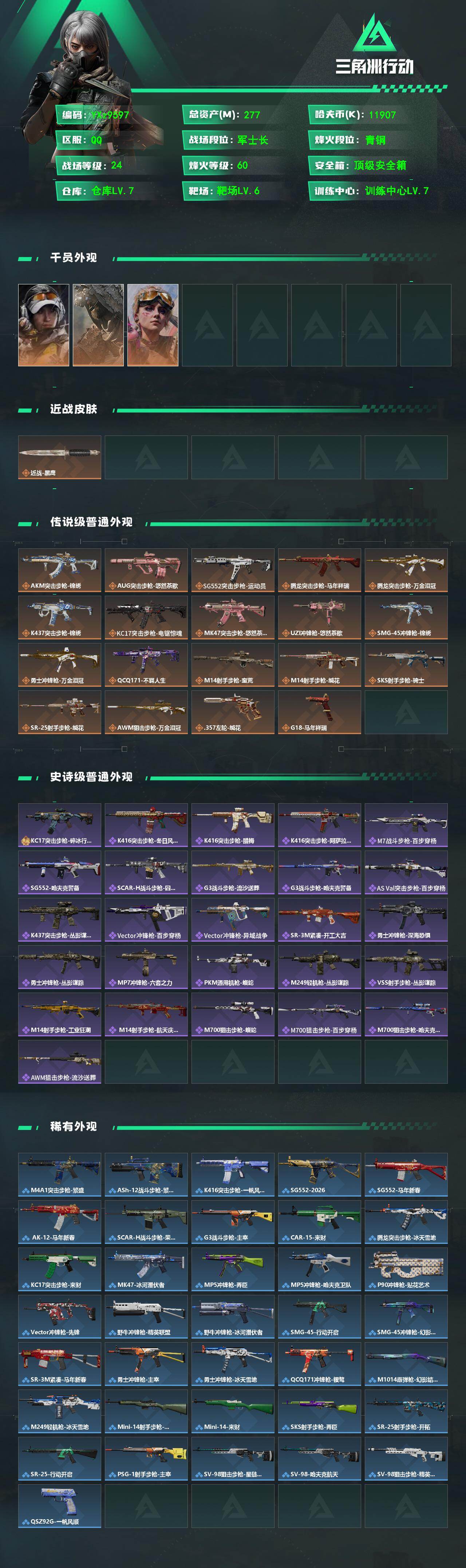 【S8赛季顶级安全箱3X3.中额资产277M+纯现金1190w.猛攻必备】【Q区三端互通】【无二次】YXz9376-特勤处:仓库7级/靶场6级/训练中心7级277m总资产-1190w哈夫币-60烽火等级-青铜-24战场等级-军士长