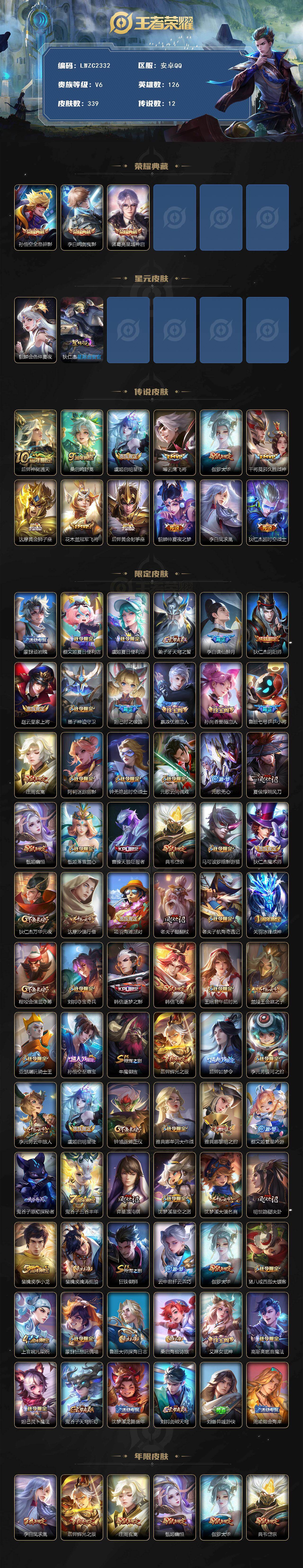 【特价出售/店主推荐】安卓Q-V6-至尊星耀III段位-126英雄-339皮肤-3典藏皮肤-2星传说-12传说-97史诗