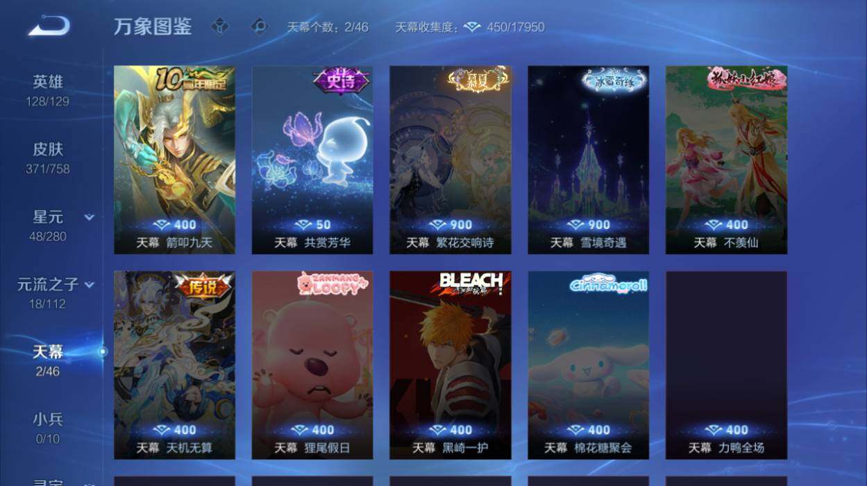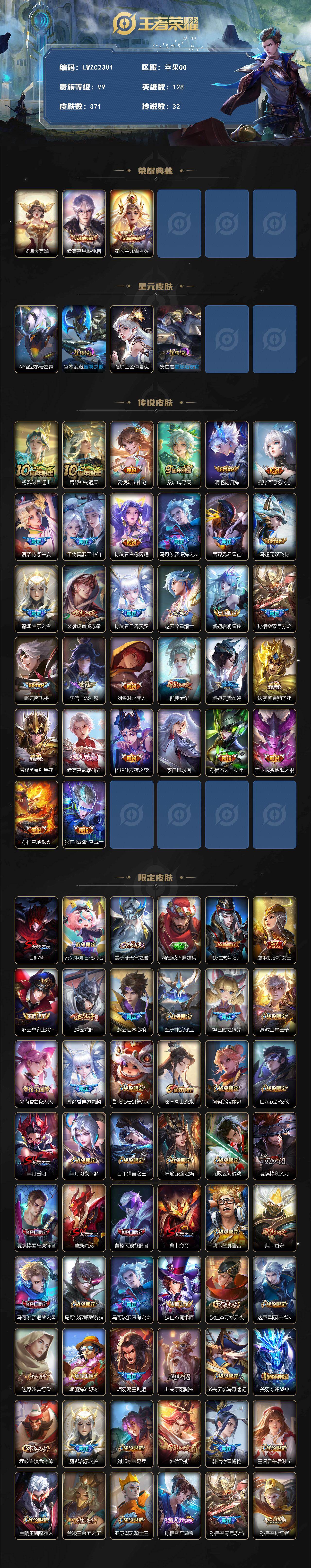 V9-至尊星耀IV段位-128英雄-371皮肤-2典藏皮肤-1典藏英雄-4星传说-32传说-114史诗