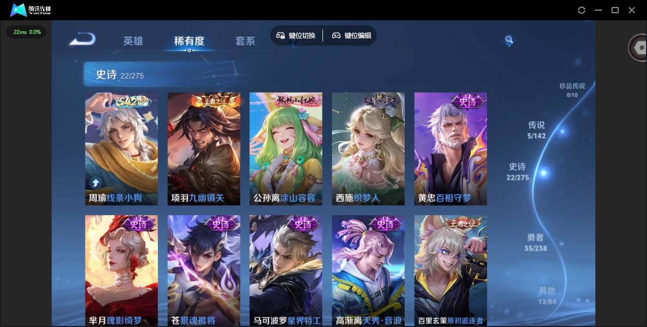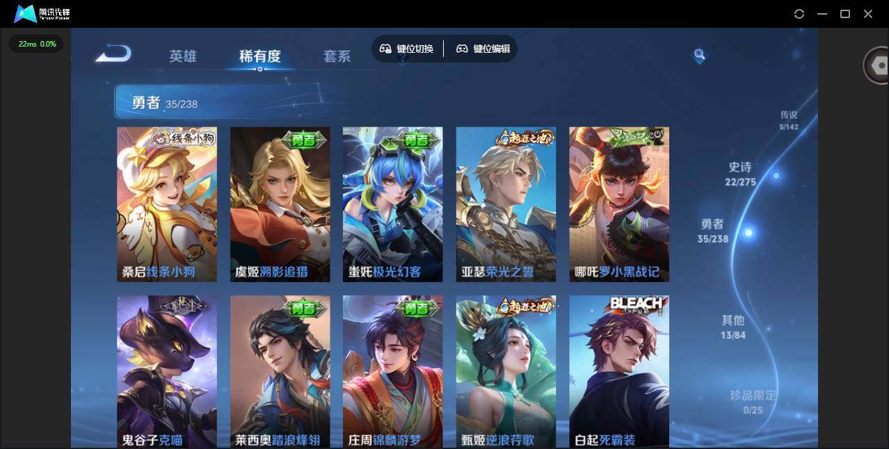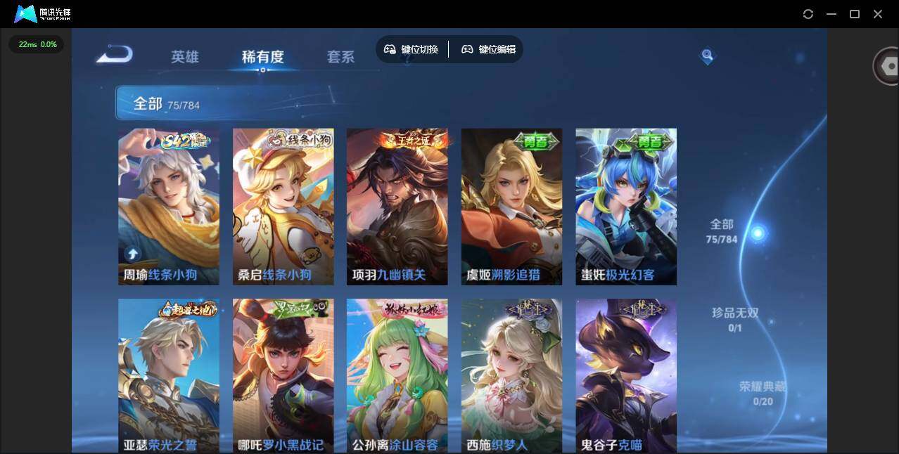 实名: 可修改 贵族等级: V5 英雄数: 95 皮肤数: 75 传说皮: 久