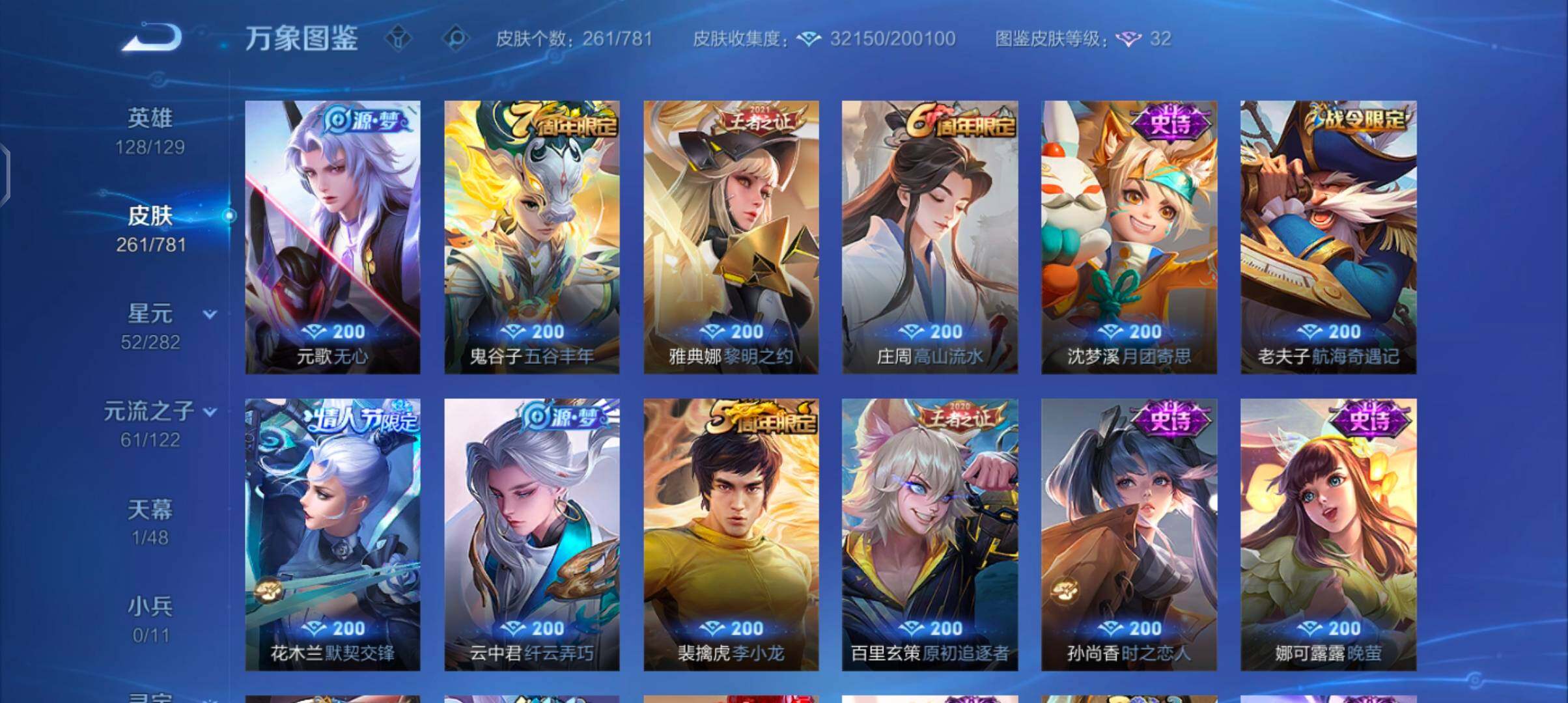 128英雄-261皮肤-27王者印记-300铭文-贵族积分0w