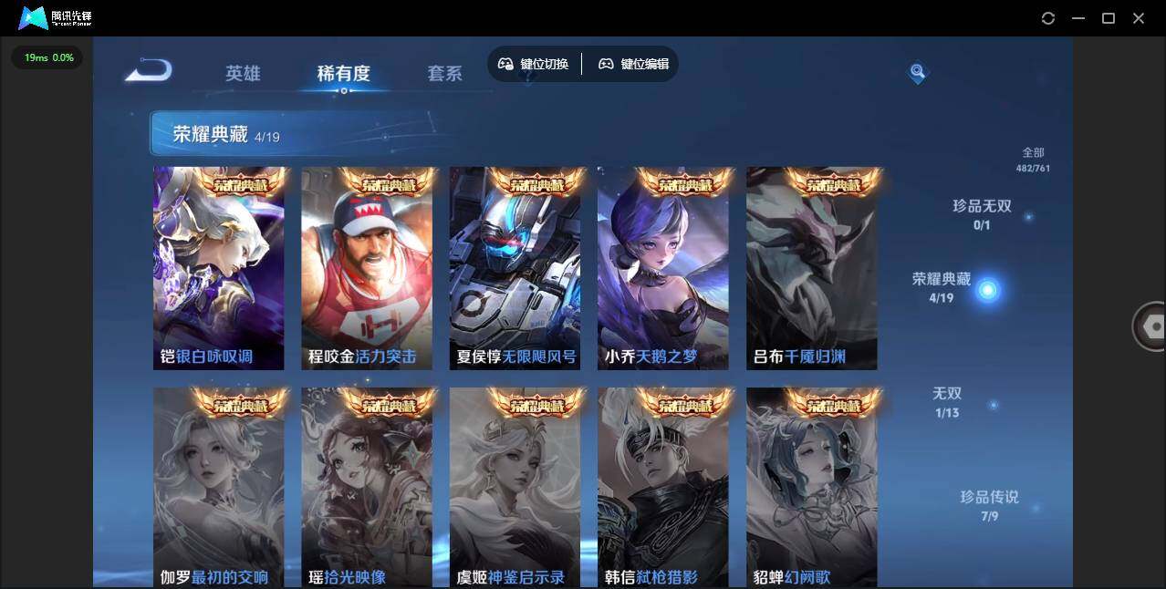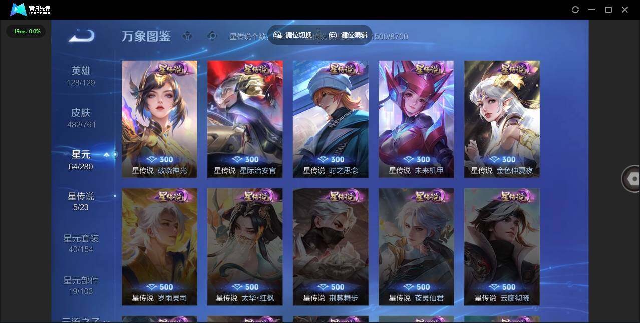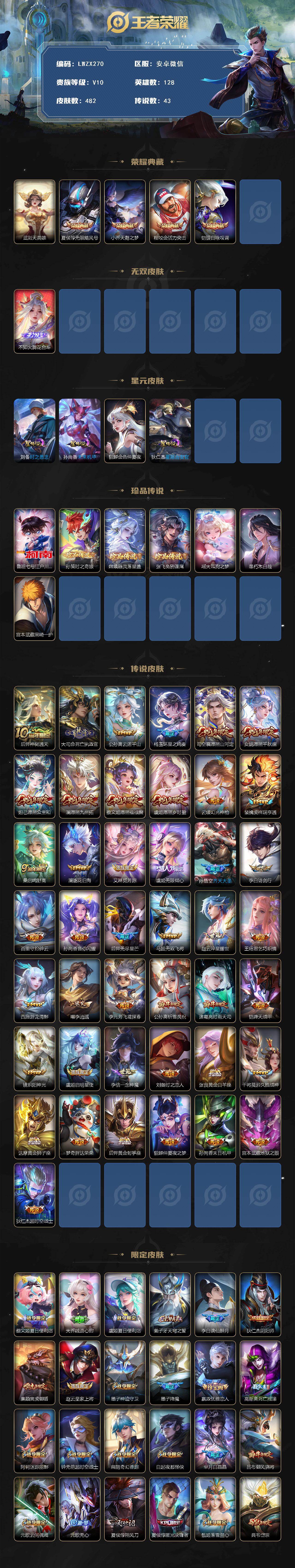 -V10-至尊星耀IV段位-128英雄-482皮肤-4典藏皮肤-1典藏英雄-1无双-7珍品传说-43传说-158史诗