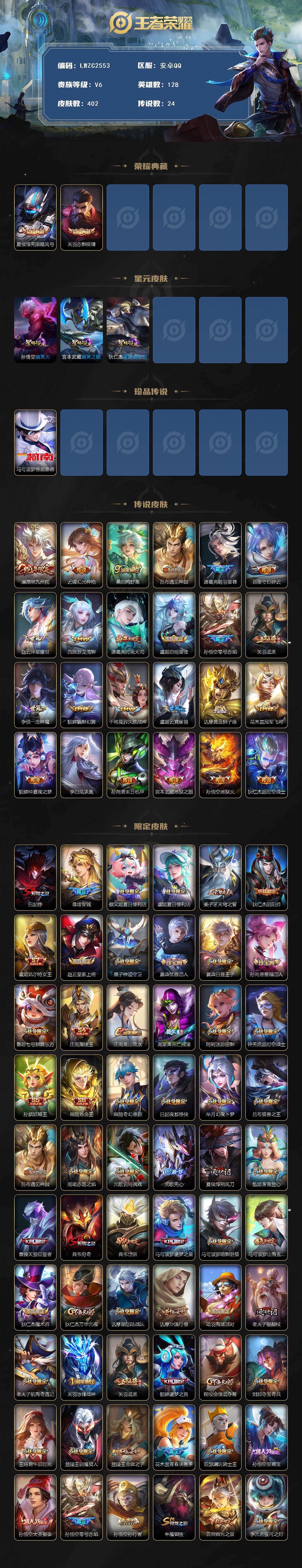 【店主推荐捡漏号!可直接换绑】安卓Q-V8-永恒钻石III段位-128英雄-402皮肤-2典藏皮肤-1珍品传说-24传说-124史诗-3星元