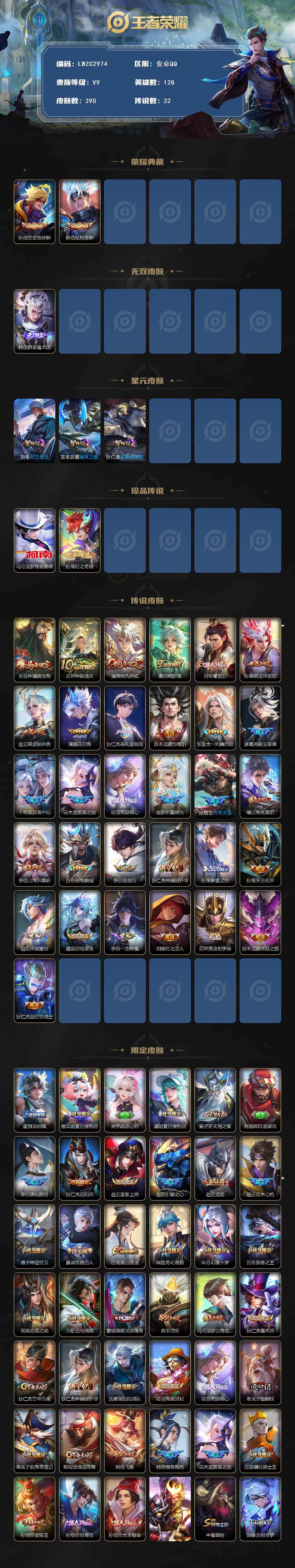 V9-至尊星耀V段位-128英雄-390皮肤-2典藏皮肤-1无双-2珍品传说-3星元-32传说-105史诗