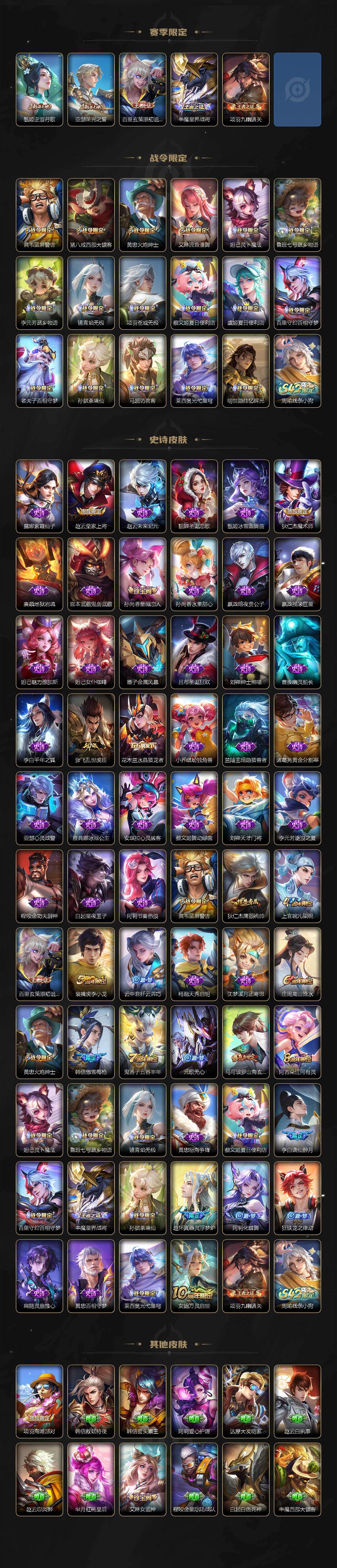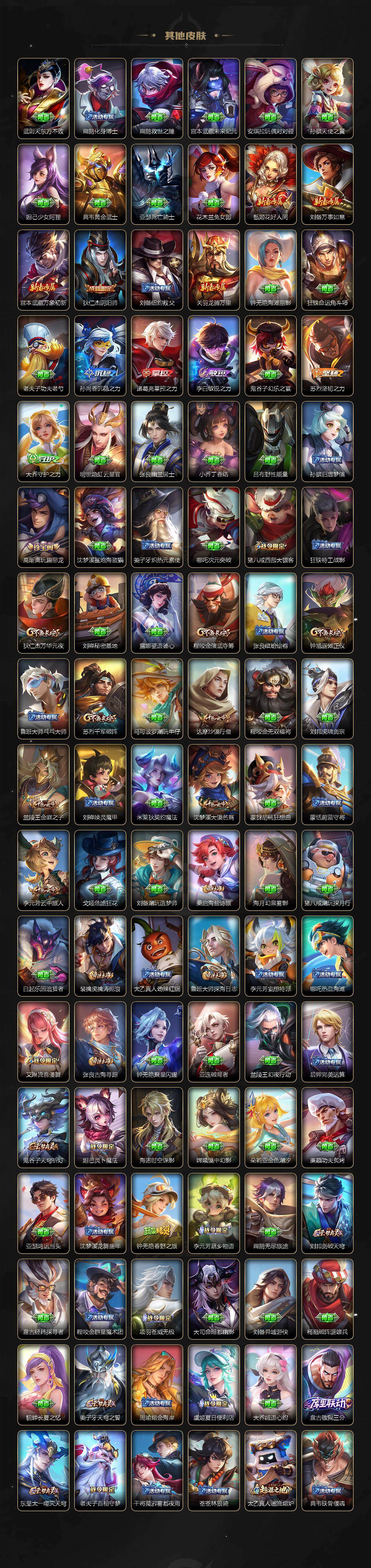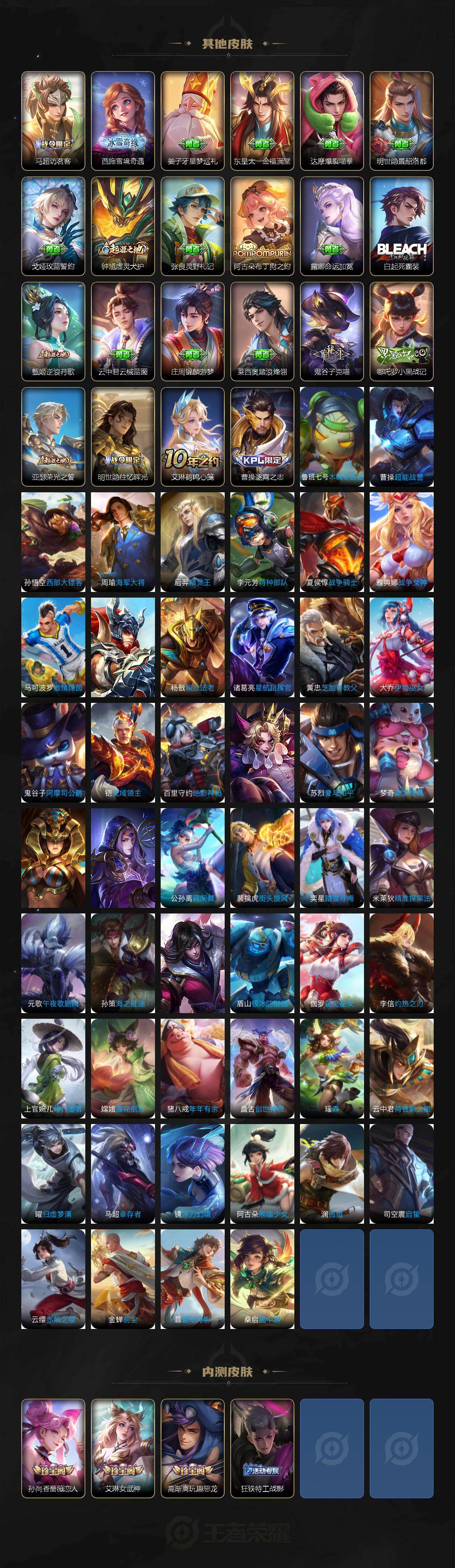【传说皮肤】:澜愿照九州拓,裴擒虎祥瑞亨通,桑启鸣野蒿,马超无双飞将,达摩黄金狮子座,貂蝉仲夏夜之梦,宫本武藏地狱之眼,狄仁杰超时空战士