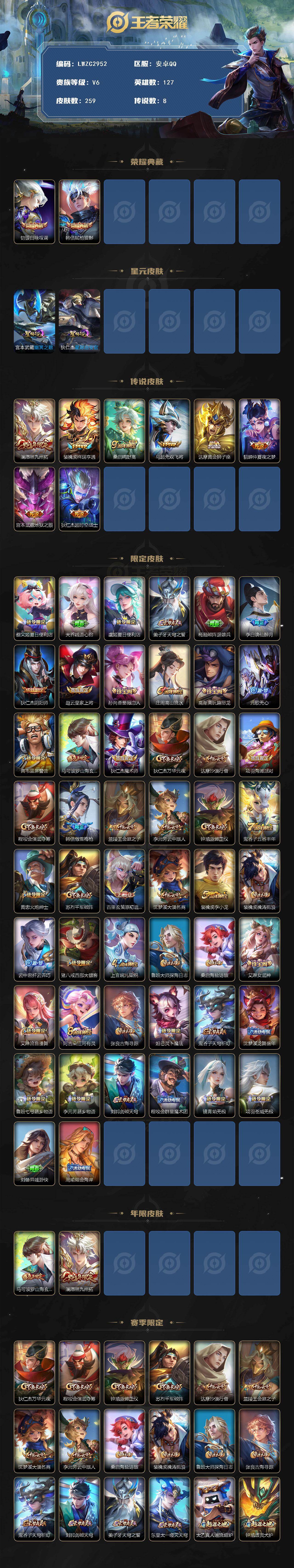 V6-至尊星耀II段位-127英雄-259皮肤-2典藏皮肤-2星元-8传说-64史诗