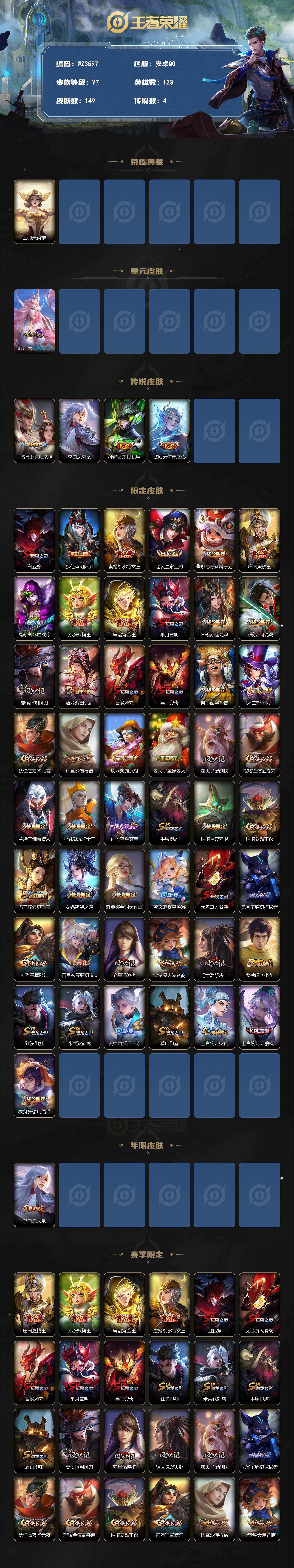 【秒换绑】安卓Q-V7-秩序白银II段位-123英雄-149皮肤-1典藏英雄-4传说-34史诗