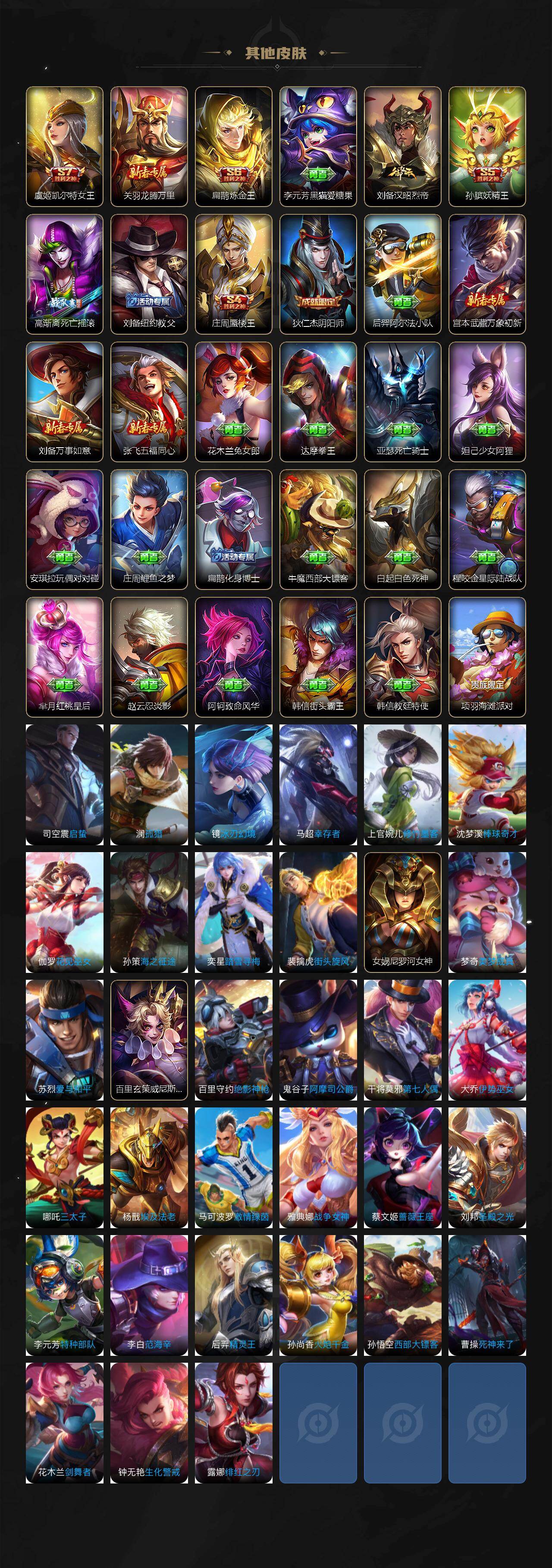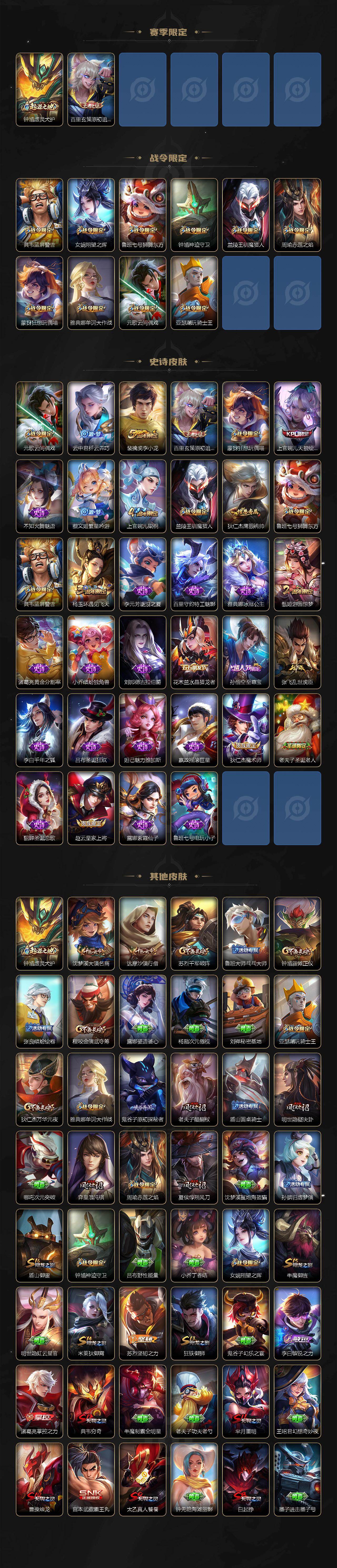 【限定皮肤】:白起狰,狄仁杰阴阳师,虞姬凯尔特女王,赵云皇家上将,鲁班七号狮舞东方,庄周蜃楼王,高渐离死亡摇滚,孙膑妖精王,扁鹊炼金王,芈月重明,周瑜赤莲之焰,元歌云间偶戏