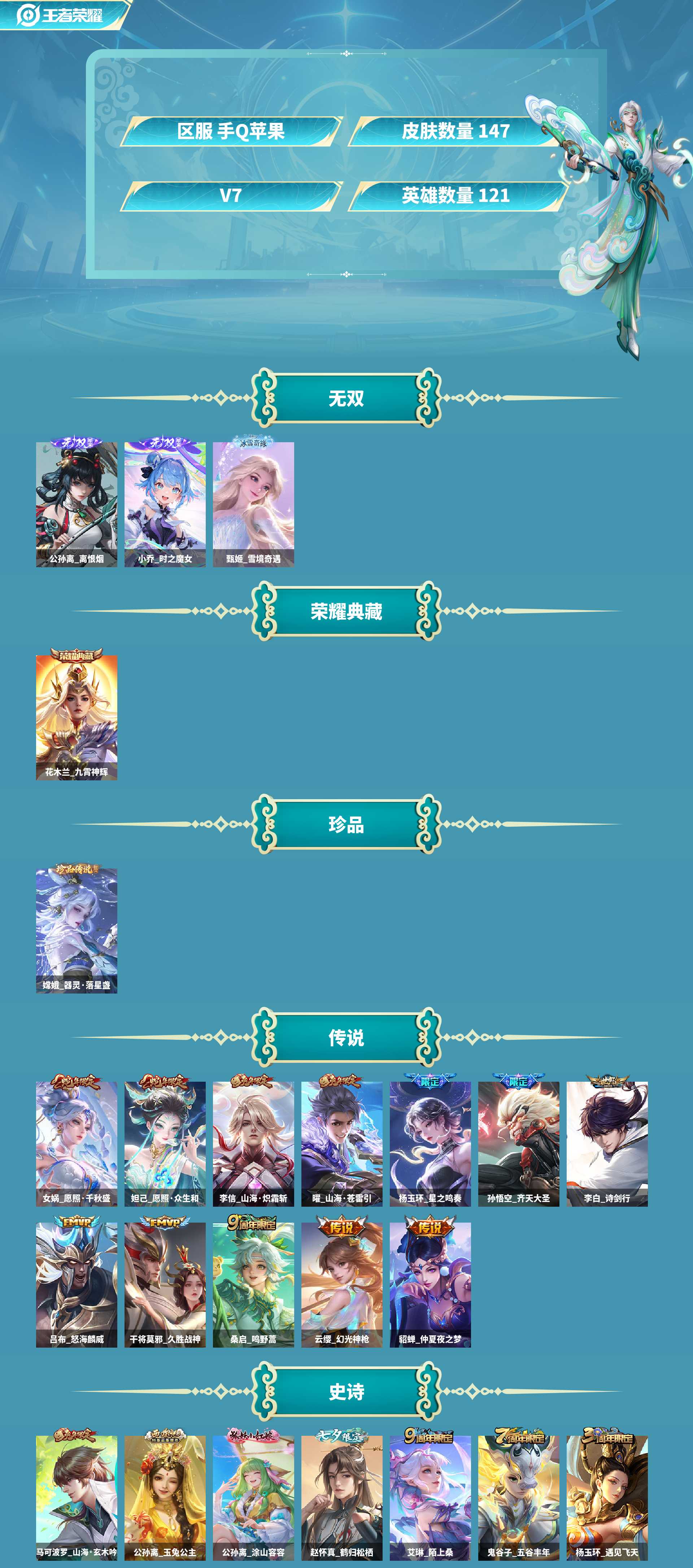 离恨烟!雪境甄姬!无双小乔!皮肤数量147印记总数9V7最强