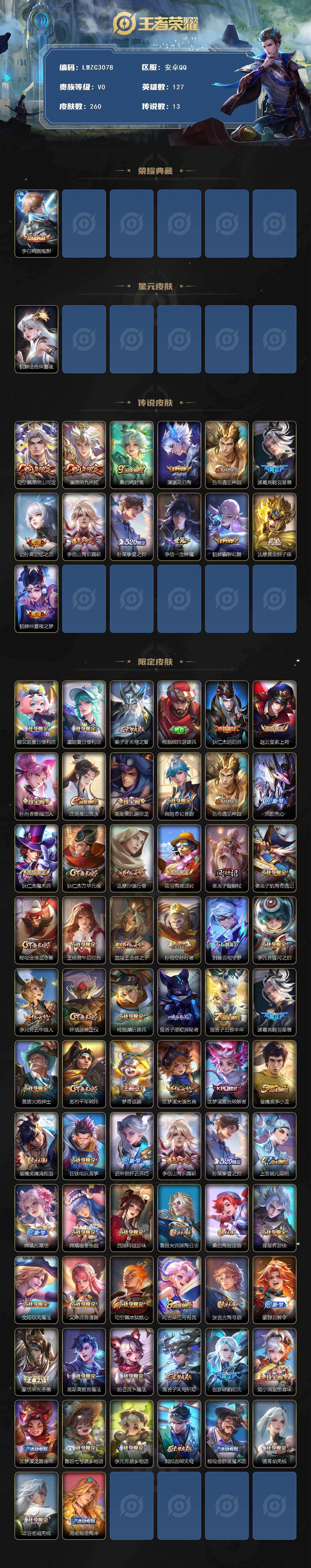 【特价出售/店主推荐】安卓Q-V0-永恒钻石V段位-127英雄-260皮肤-1典藏皮肤-1星传说-13传说-82史诗