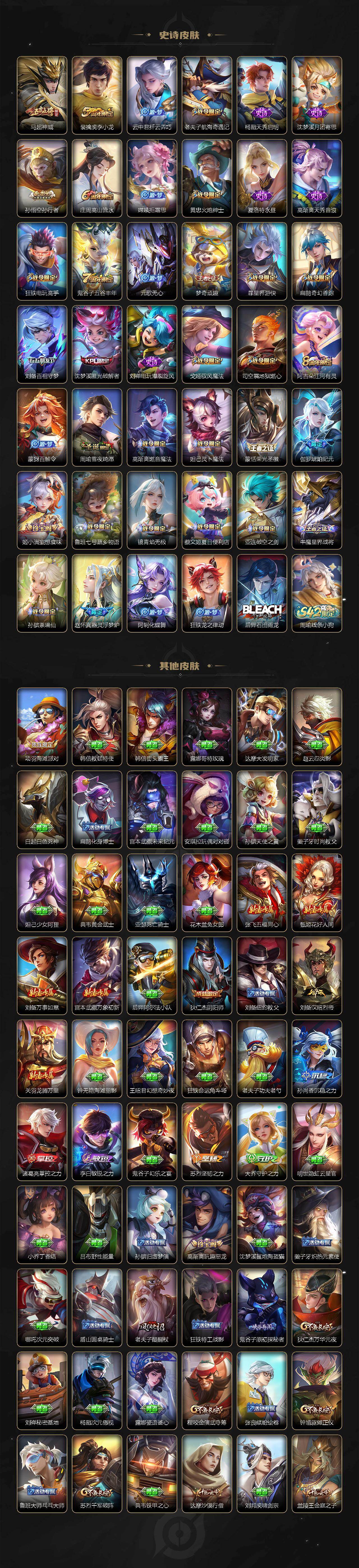 【传说皮肤】:司空震愿照山河定,澜愿照九州拓,桑启鸣野蒿,澜逐花归海,吕布遇见神鼓,诸葛亮鹤羽星尊,公孙离记忆之芯,李信